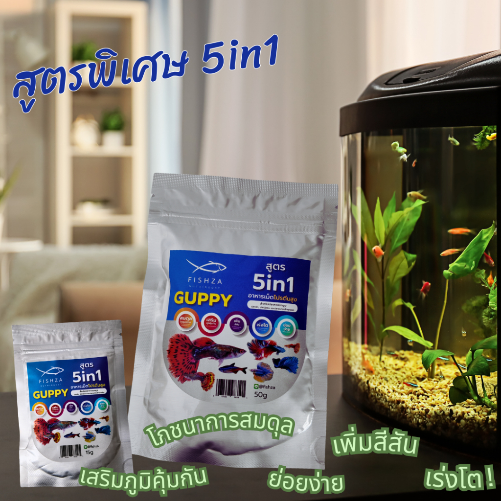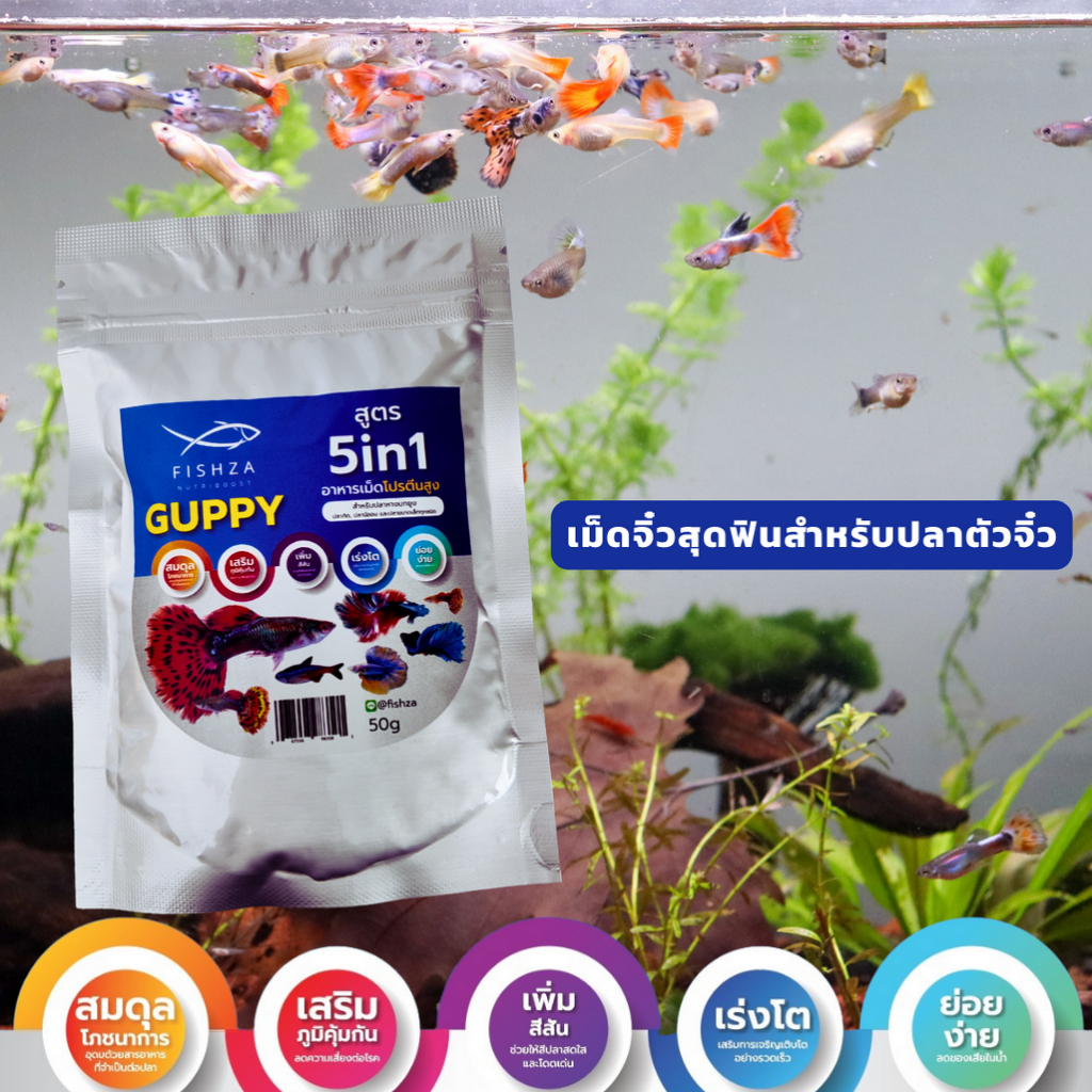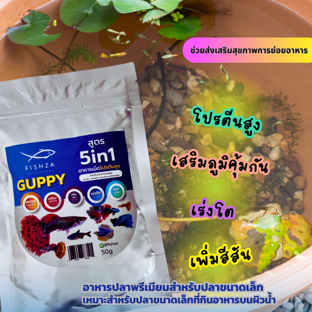 Fishza (ฟิสซ่า) อาหารเม็ดปลาหางนกยูงและปลาขนาดเล็ก สูตร5In1 โปรตีน วิตามิน แร่ธาตุสูง โตไว สีสวย 50g