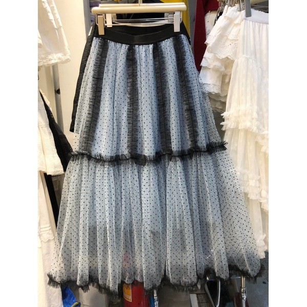 Qooth A-line Polka Dot Tulle กระโปรงยาวเอวสูงกระชับสัดส่วนกระโปรงแกว่งขนาดใหญ่แฟชั่นหรูหรา QT2604
