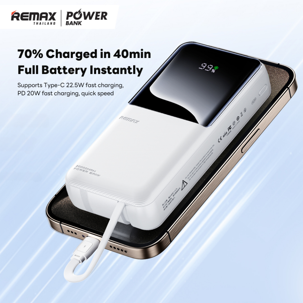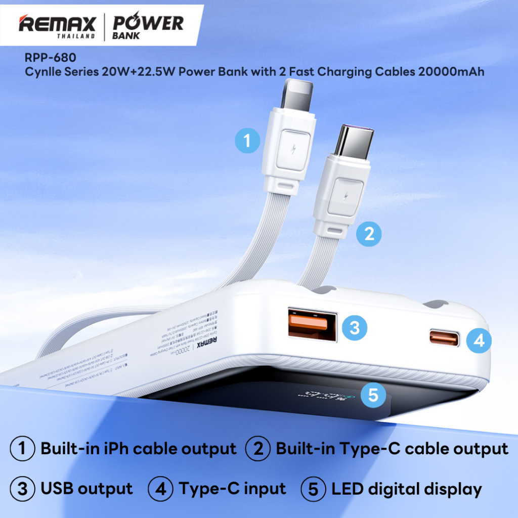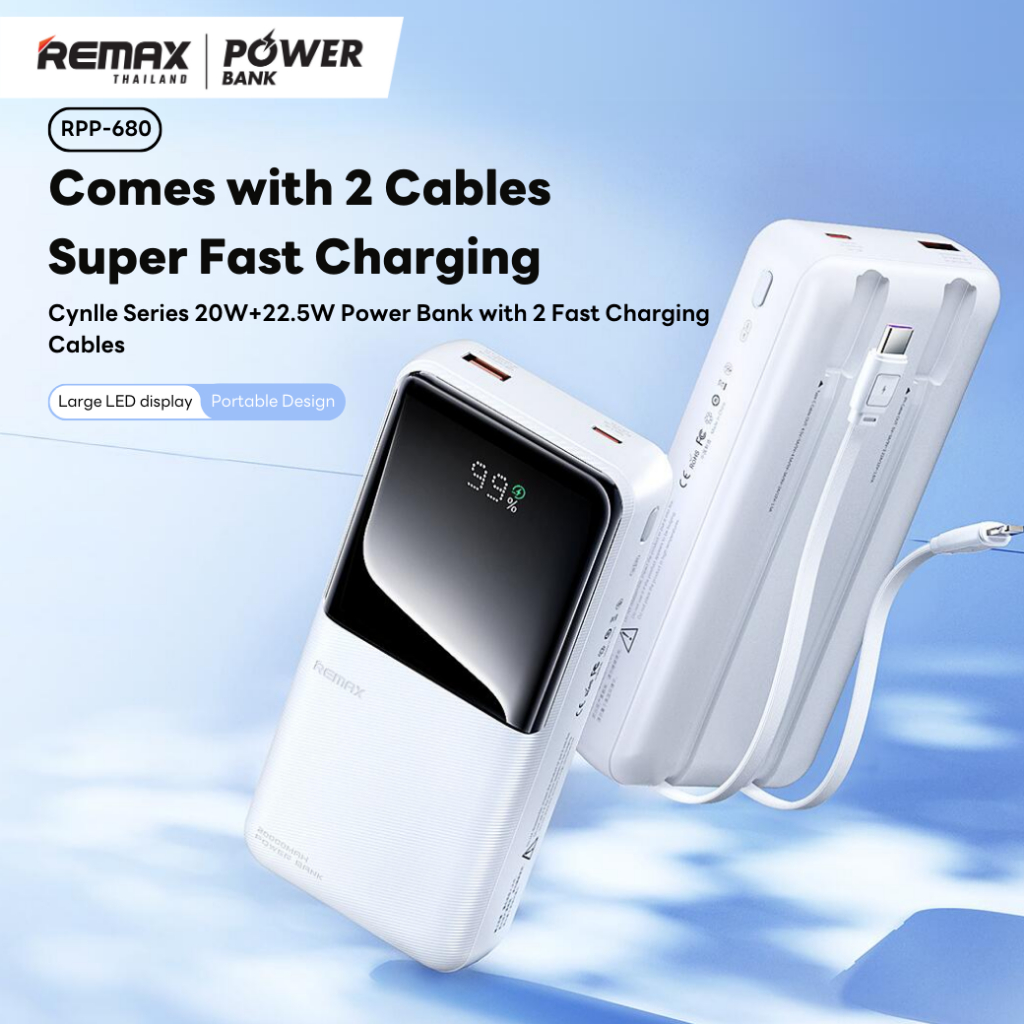 [ CCC ] Remax Power Bank รุ่น RPP-680 แบตสำรอง ความจุ 20000mAh สายชาร์จในตัว ชาร์จไว มีประกันศูนย์ไทย มาตรฐาน มอก.