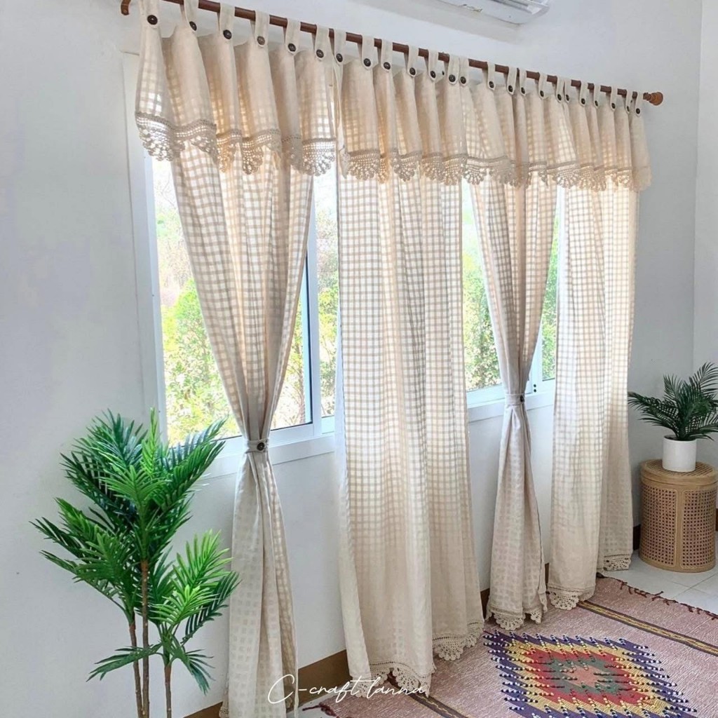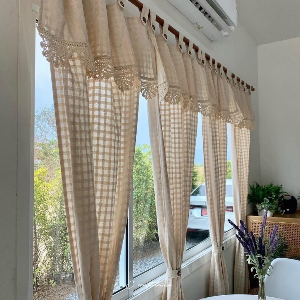 🌼ผ้าม่านผ้าฝ้ายสไตล์มินิมอล ลายตารางสีครีม แบบมีเชิง มีกระดุมถอด-แกะได้ ถักลูกไม้บน-ล่าง