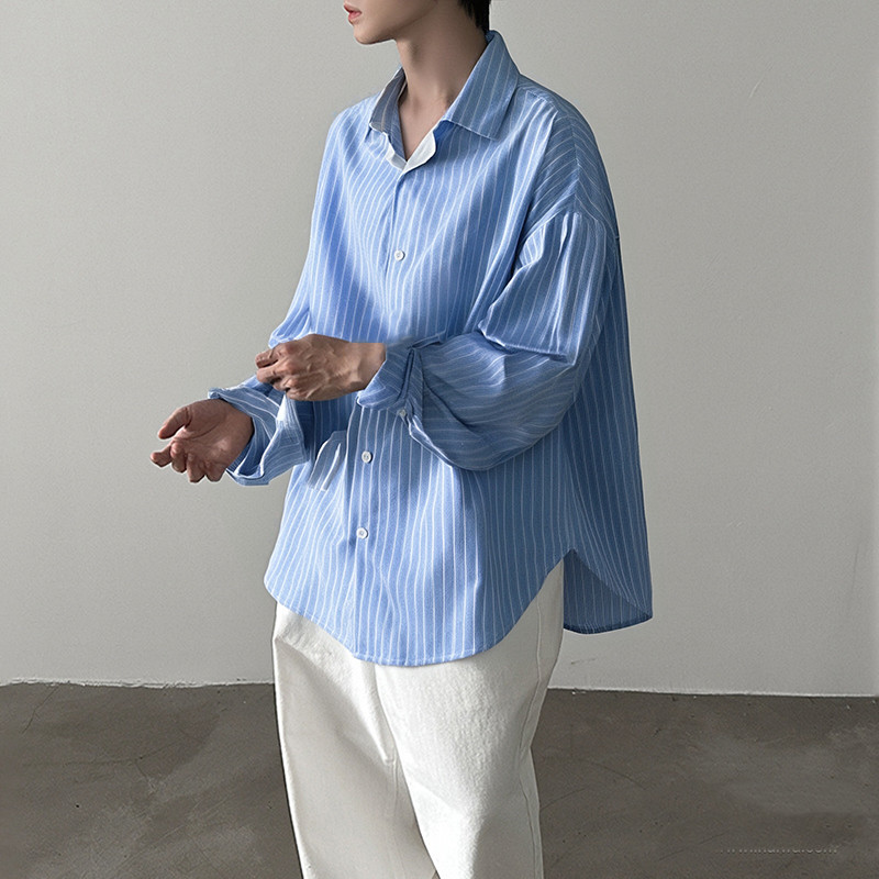ไม่แน่นอน เสื้อเชิ้ตแขนยาวทรงหลวมลายทางสําหรับผู้ชาย