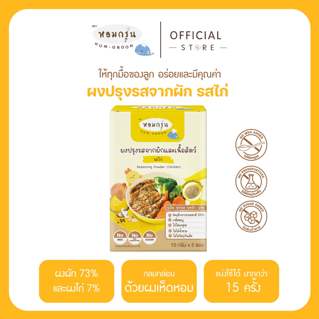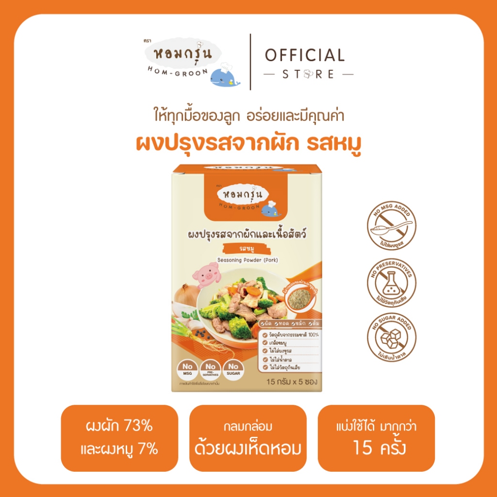 หอมกรุ่น - ผงสามเกลอเครื่องปรุงเด็ก ไม่มีผงชูรส ไม่มีน้ำตาล วัตถุดิบจากผักและเนื้อสัตว์ 1 ขวบขึ้นไป (15 ก. X 5 ซอง)