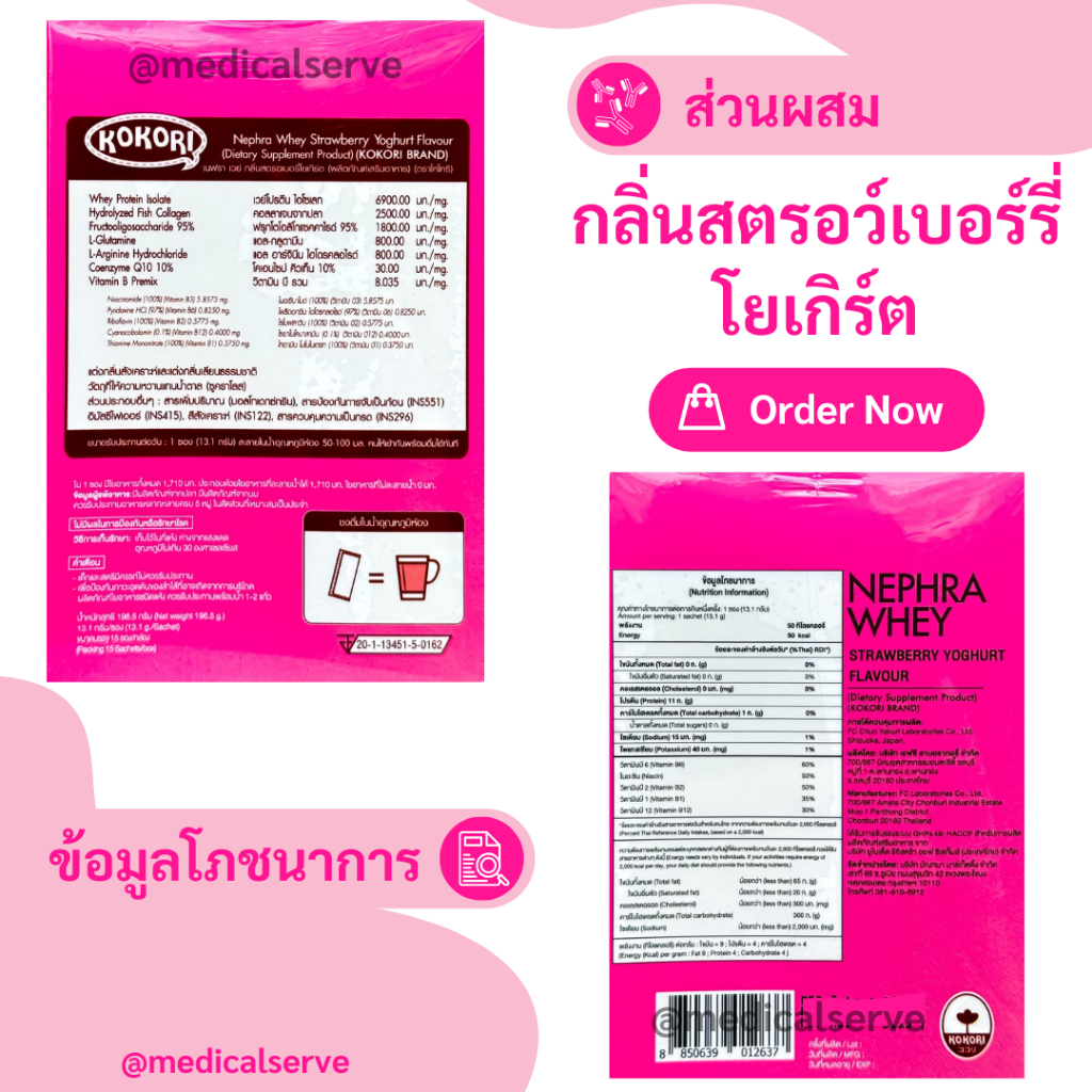 แบบใหม่❗(15 ซอง/กล่อง) เวย์โปรตีนสตรอว์เบอร์รี่โยเกิร์ต Kokori Nephra Whey StrawberryYoghurt Flavour