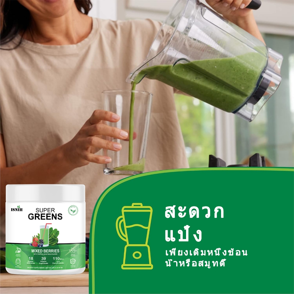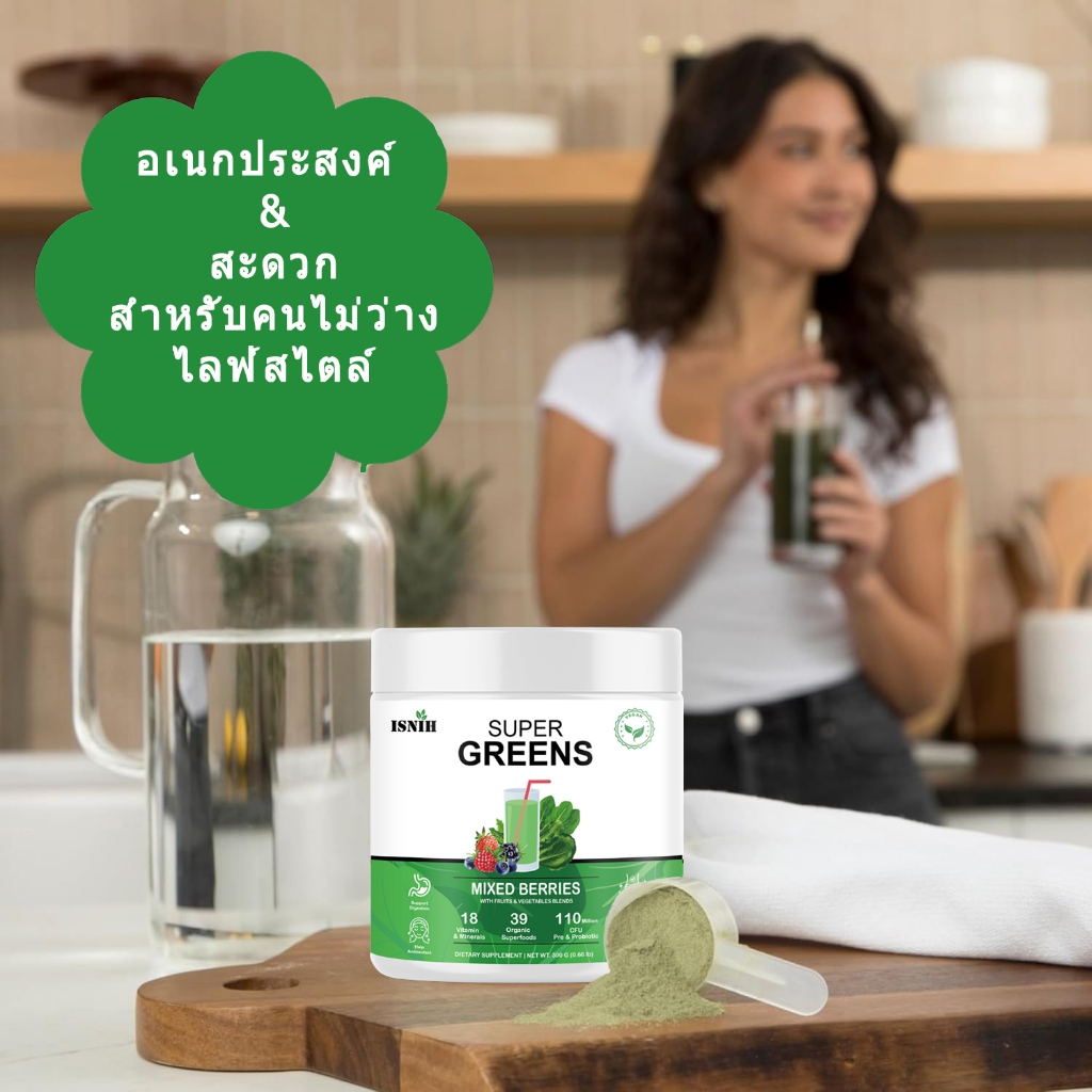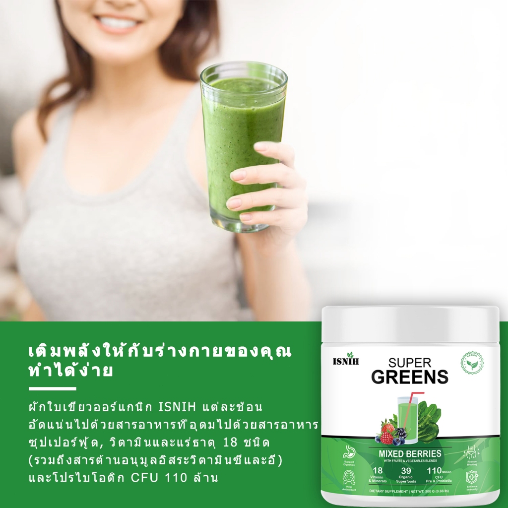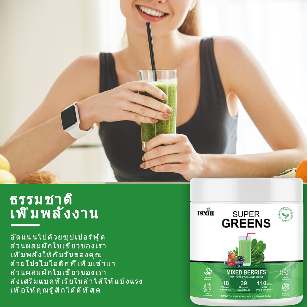 ISNIH Super Greens Powder วิตามินรวม สนับสนุนสุขภาพลำไส้ Organic Green ผงผักรวม รสเบอร์รี่รวม 300g
