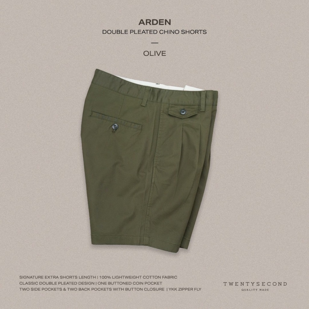 TWENTYSECOND กางเกงขาสั้น ผ้าชิโน มีจีบ รุ่น Arden Double Pleated Shorts - เขียว / Olive