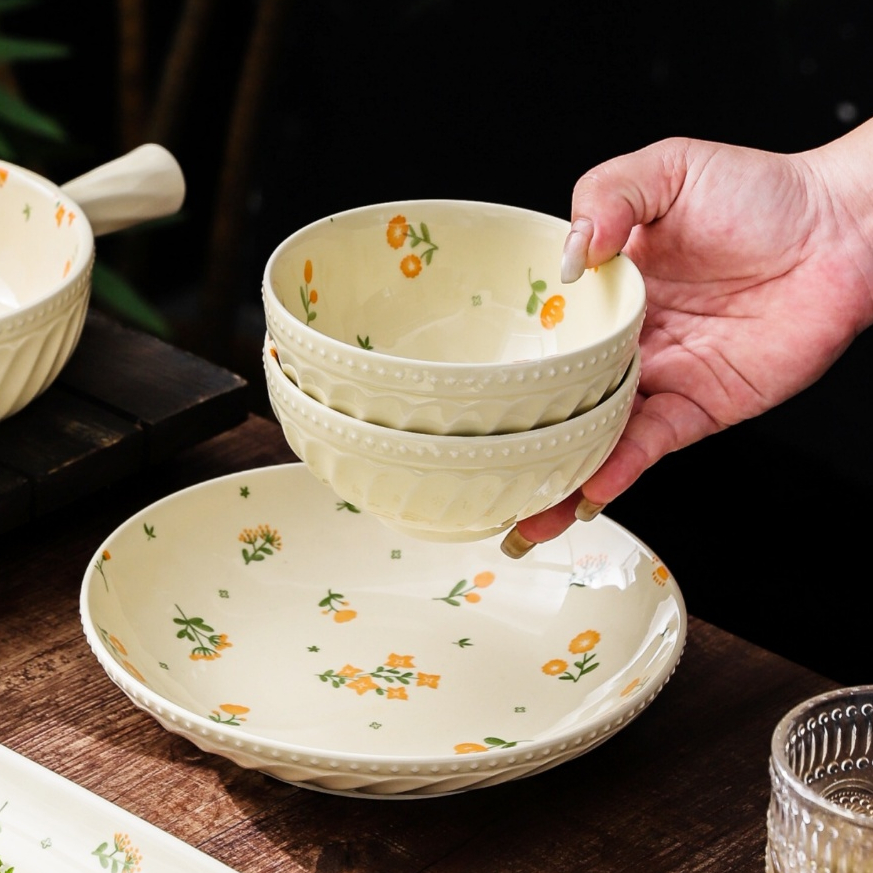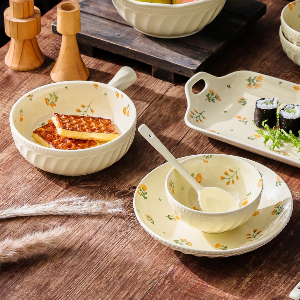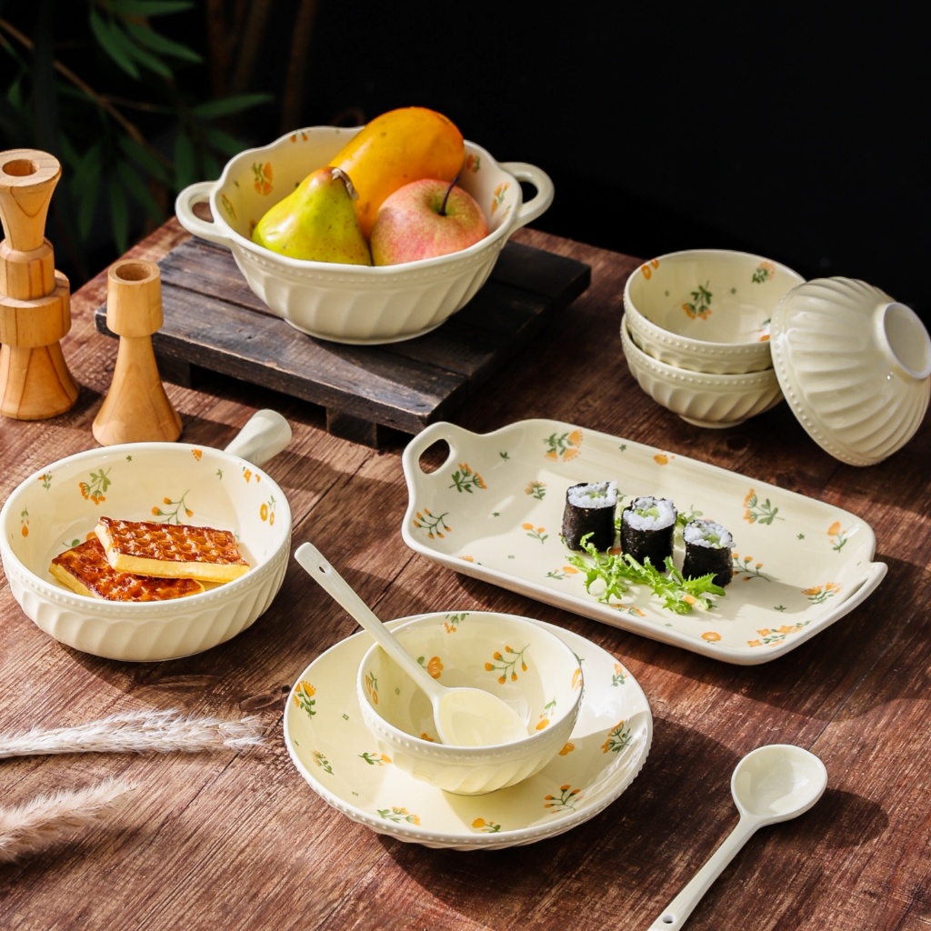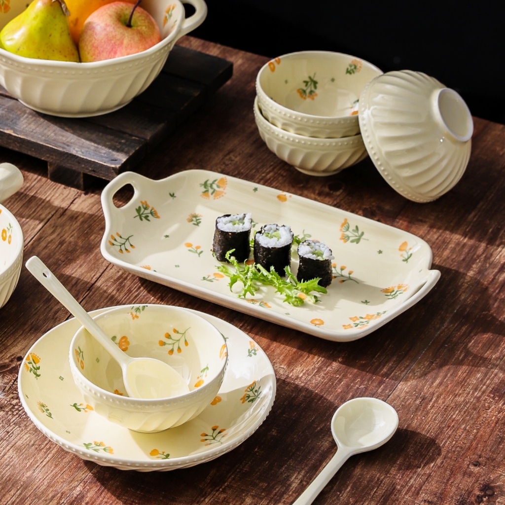 HongDian ชุดเซรามิก ceramic porcelain tableware set bowl plate เคลือบใต้เคลือบ underglaze ลายดอกไม้ ดีไซน์หรูหรา ปลอดภัยต่ออาหาร ไม่เป็นพิษ ทนความร้อน สีไม่ซีดจาง ใช้กับ microwave oven ได้ ล้างใน dishwasher และตู้ฆ่าเชื้อ ทำความสะอาดง่าย มีทั้งชามหูจั