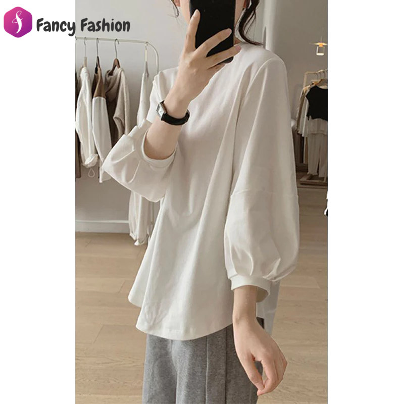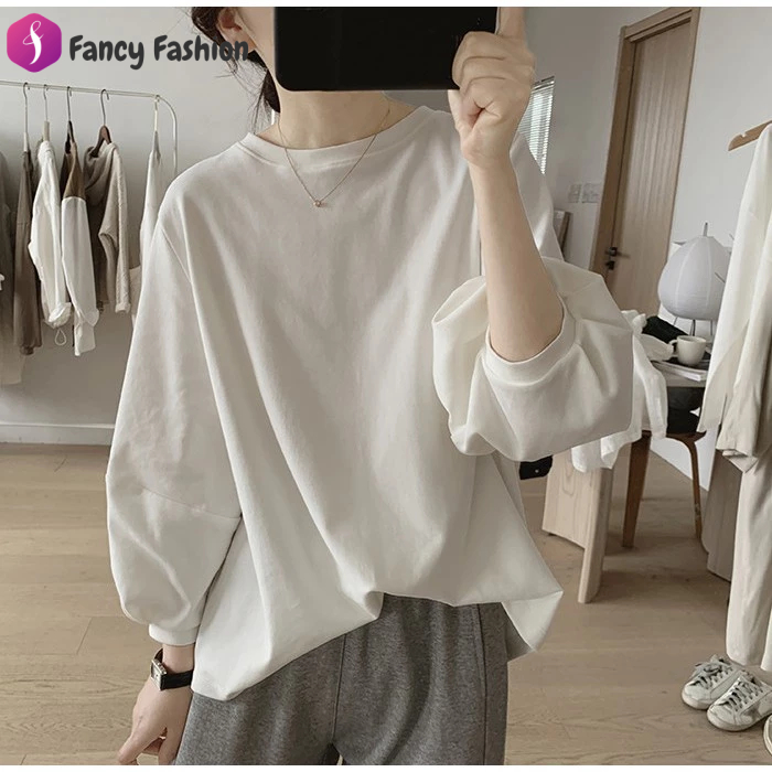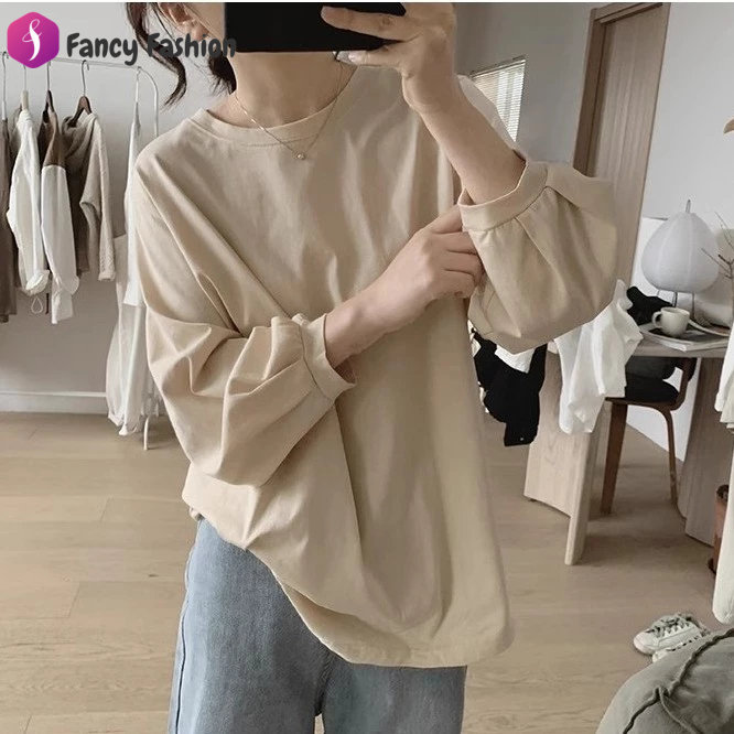 Fancy Fashion เสื้อยืดแขนยาวผู้หญิงสไตล์เกาหลี ลำลองทรงหลวม เสื้อยืดแขนบอลลูนแฟชั่นมาใหม่สวยๆ สีพื้น