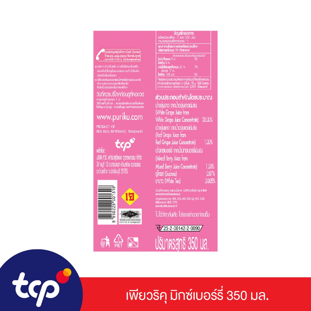 [รวมส่ง] เพียวริคุ ชาขาว มิกซ์เบอร์รี่ 350 มล. ยกลัง 24 ขวด Puriku Mixed Berry 350 ml. Pack 24 (TCP)