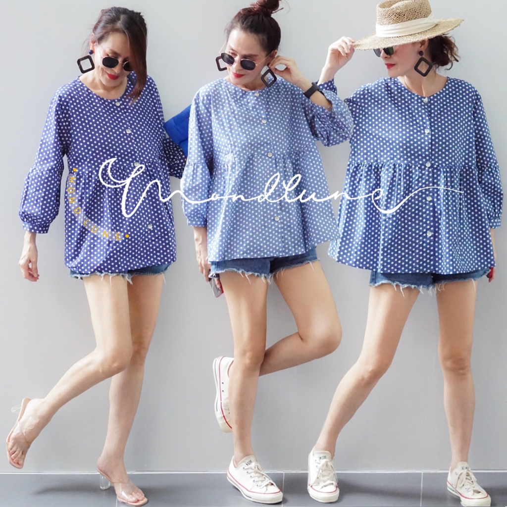 #3342 MondLune เสื้อเบลาส์คอกลม กระดุมผ่าหน้า แต่งระบายเอว แขนพอง บอลลูน ผ้ายีนส์เทียมลายจุด
