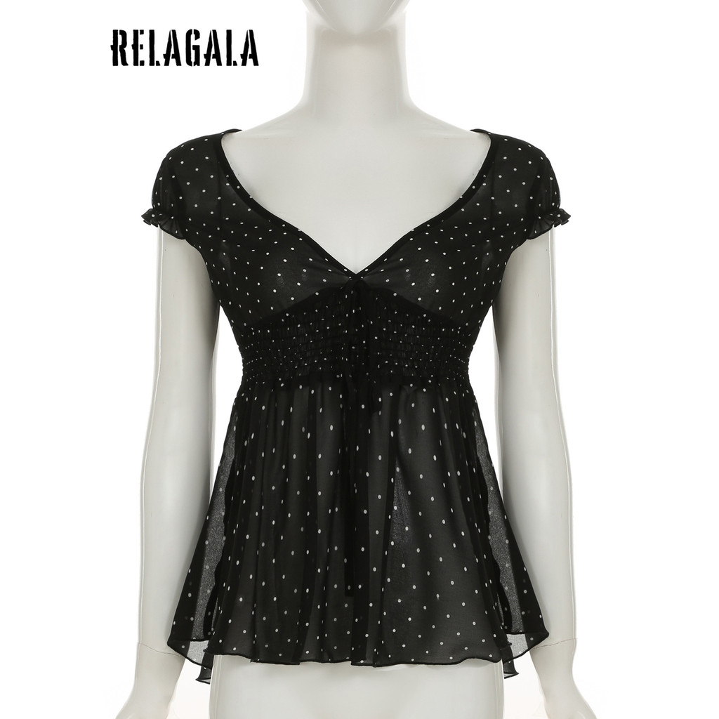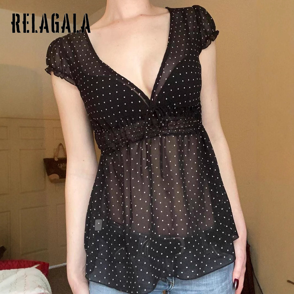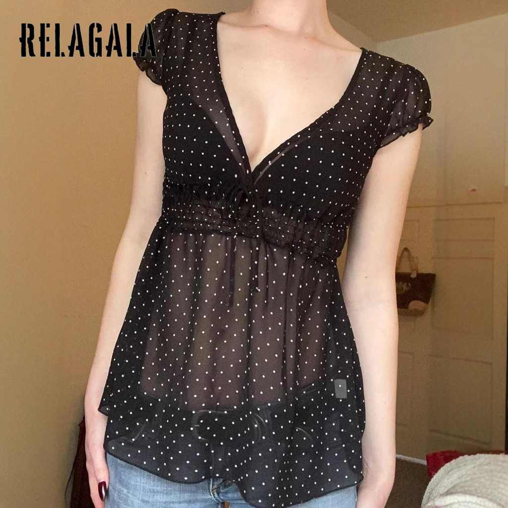 เสื้อยืดผู้หญิงลายจุด คอวี ซีทรู สไตล์เซ็กซี่ สำหรับใส่ลำลอง