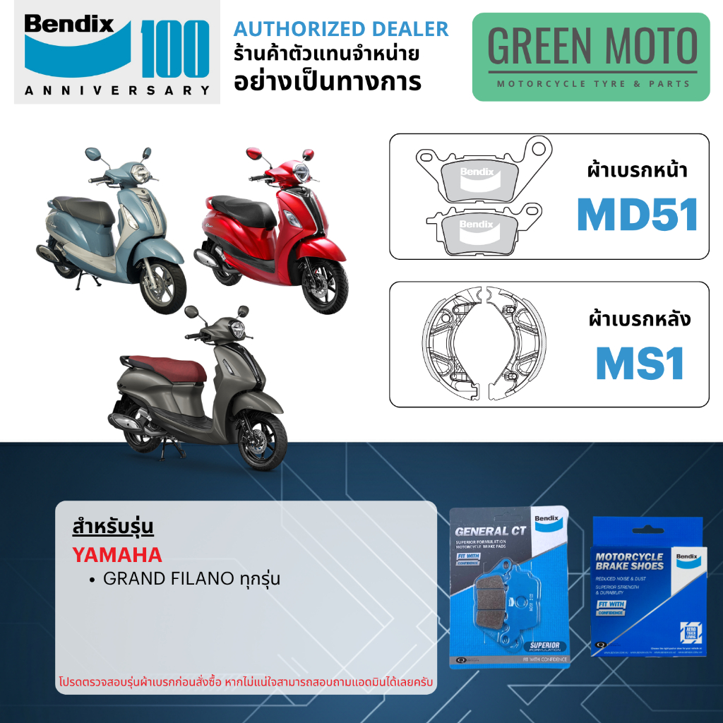 ผ้าเบรค BENDIX จัดชุดสำหรับ GRAND FILANO ทุกรุ่น เบรคหน้า-หลัง รหัส หน้า MD51 หลัง MS1 ของแท้