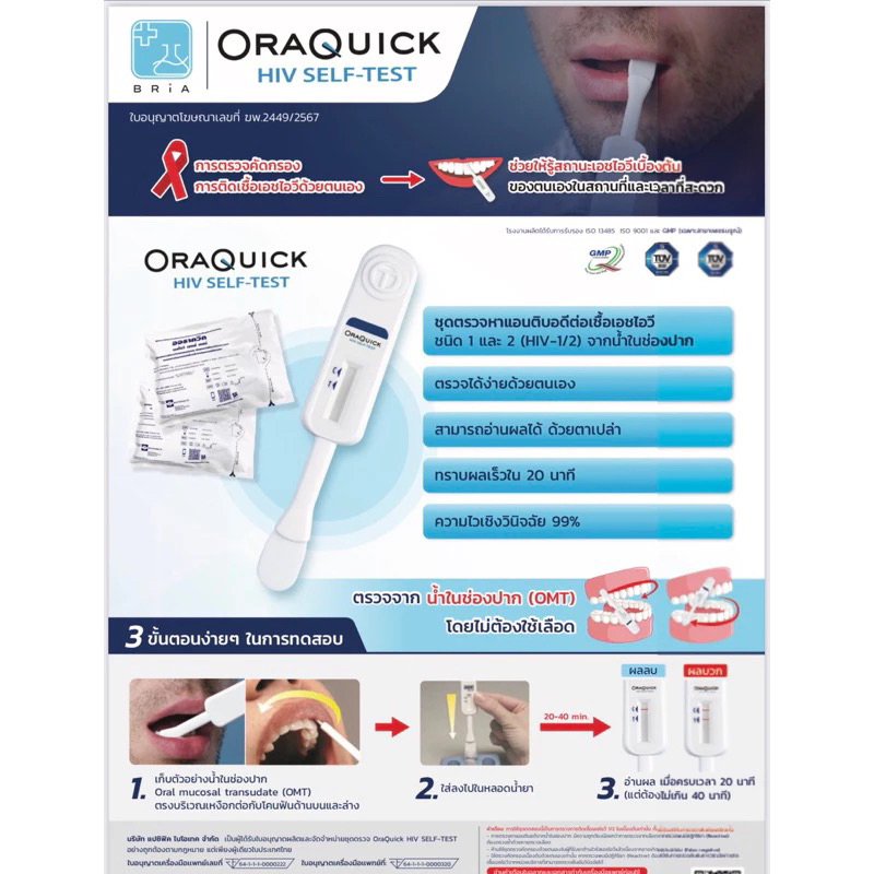 HIV Self Test Kit OraQuick ชุดตรวจเอชไอวี(เอดส์)ด้วยตนเอง ความไว99%ออราควิก เอชไอวี ไม่ต้องเจาะเลือดตรวจจากน้ำในช่องปาก