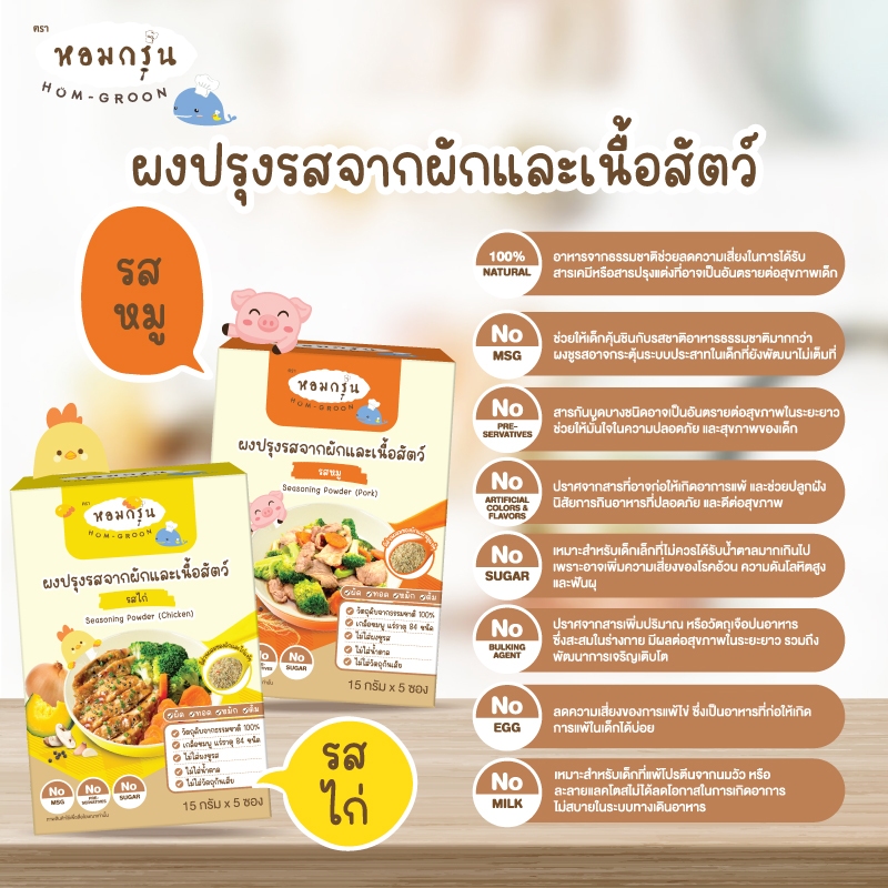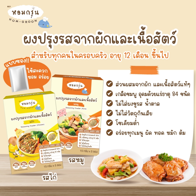 [เซต 5 ชิ้น] Homgroon หอมกรุ่นผงปรุงรสจากผักและเนื้อสัตว์ 2 กล่อง + หัวเชื้อน้ำต้มกระดูก 3 ซอง (15 ก. x5 ซอง + 100 มล.)