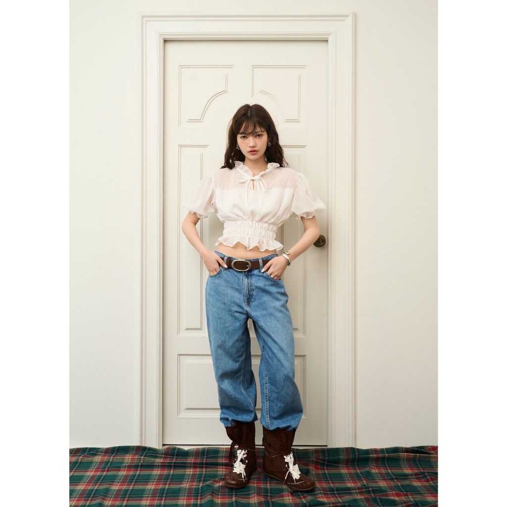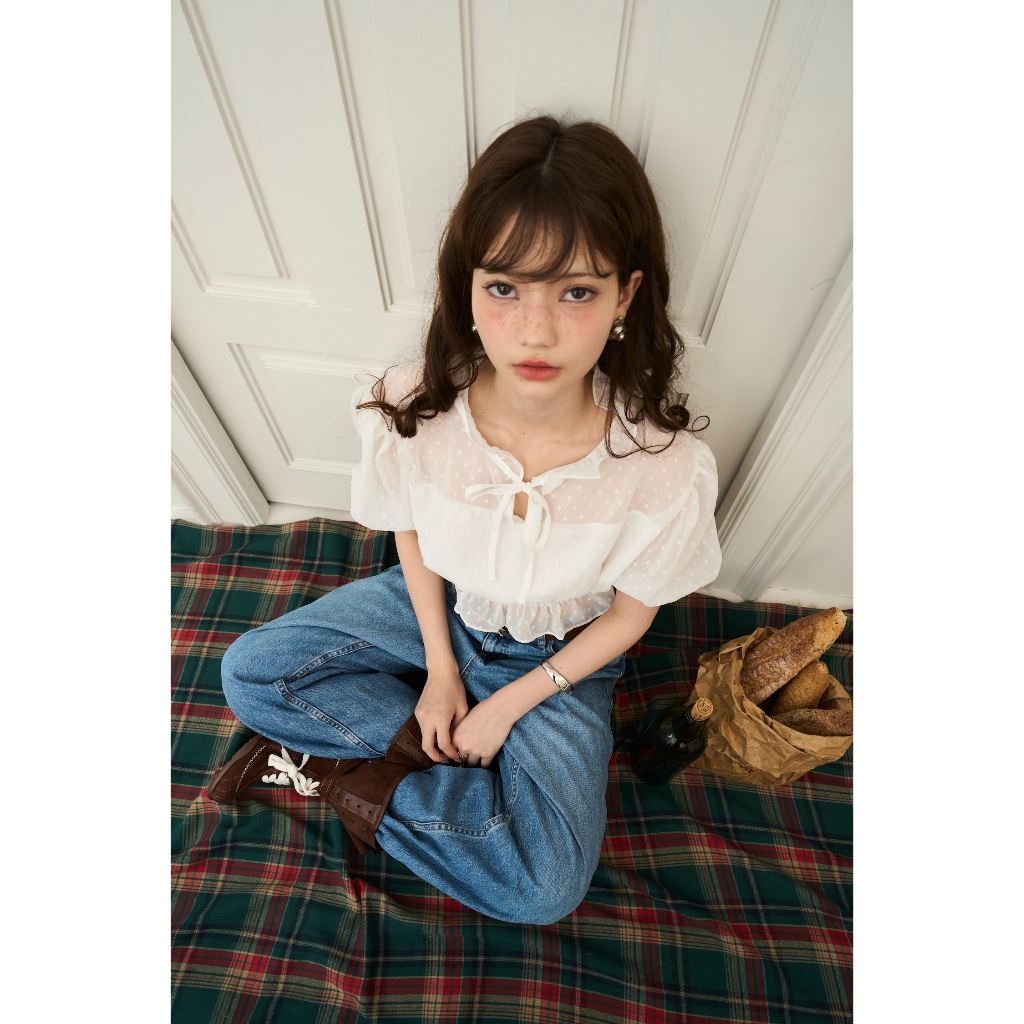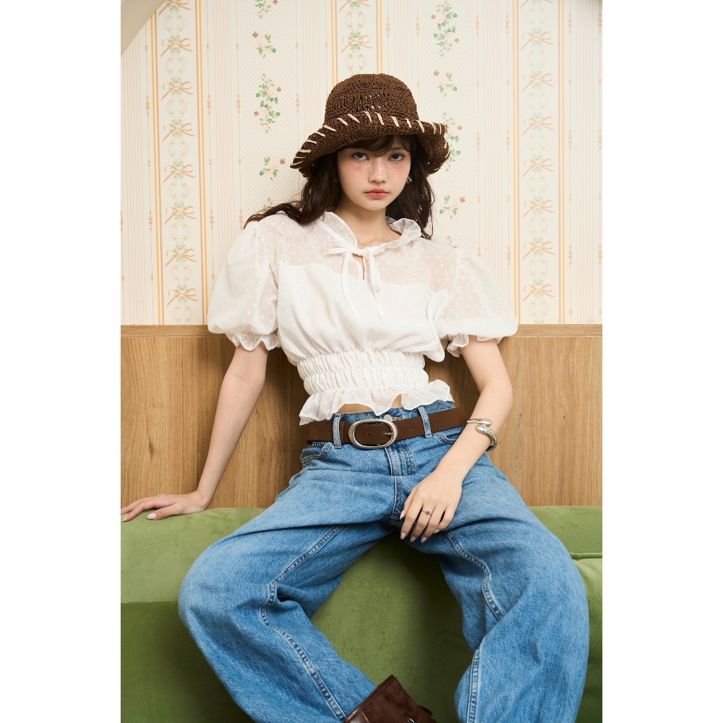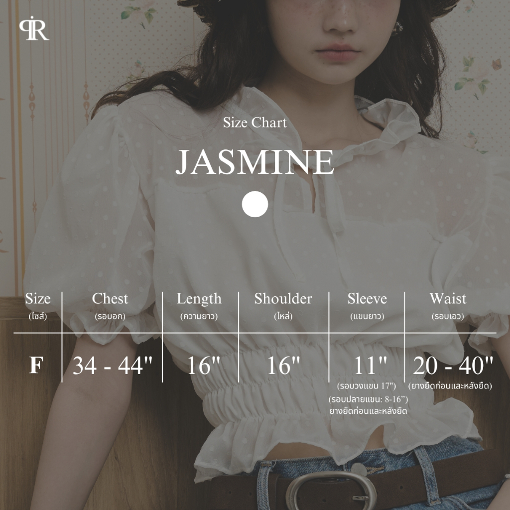 Panchitar Jasmine – เสื้อชีฟองลายจุดสีขาว สม็อกช่วงเอวช่วยเก็บทรงให้เอวสวย