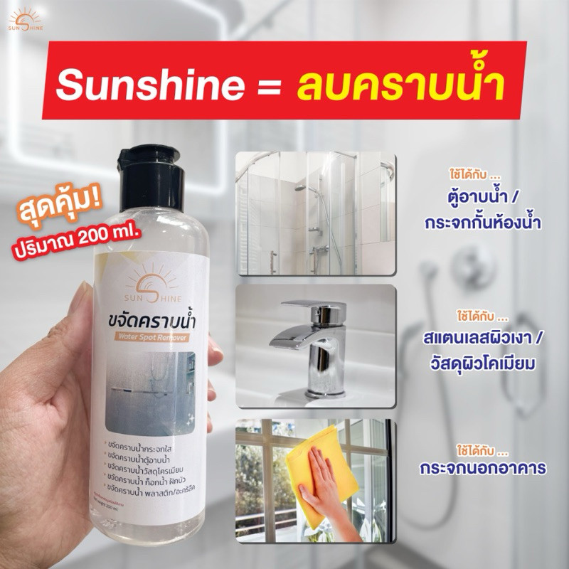 น้ำยาขจัดคราบกระจก ขจัดคราบหินปูน คราบน้ำ คราบสบู่ Sunshine 200ML ใช้งานง่าย แค่ใช้น้ำยาขจัดคราบก่อน