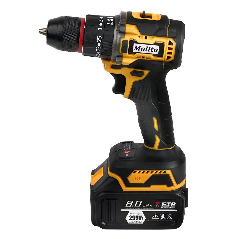 MOLITA สว่านไร้สาย 299V 3ระบบ มอเตอร์บัสเลส แบตเตอรี่ใหญ่ 2 ก้อน เครื่องมือช่าง รวม 32ชิ้น รุ่น M4-มอเตอร์บัสเลส สีเหลือ
