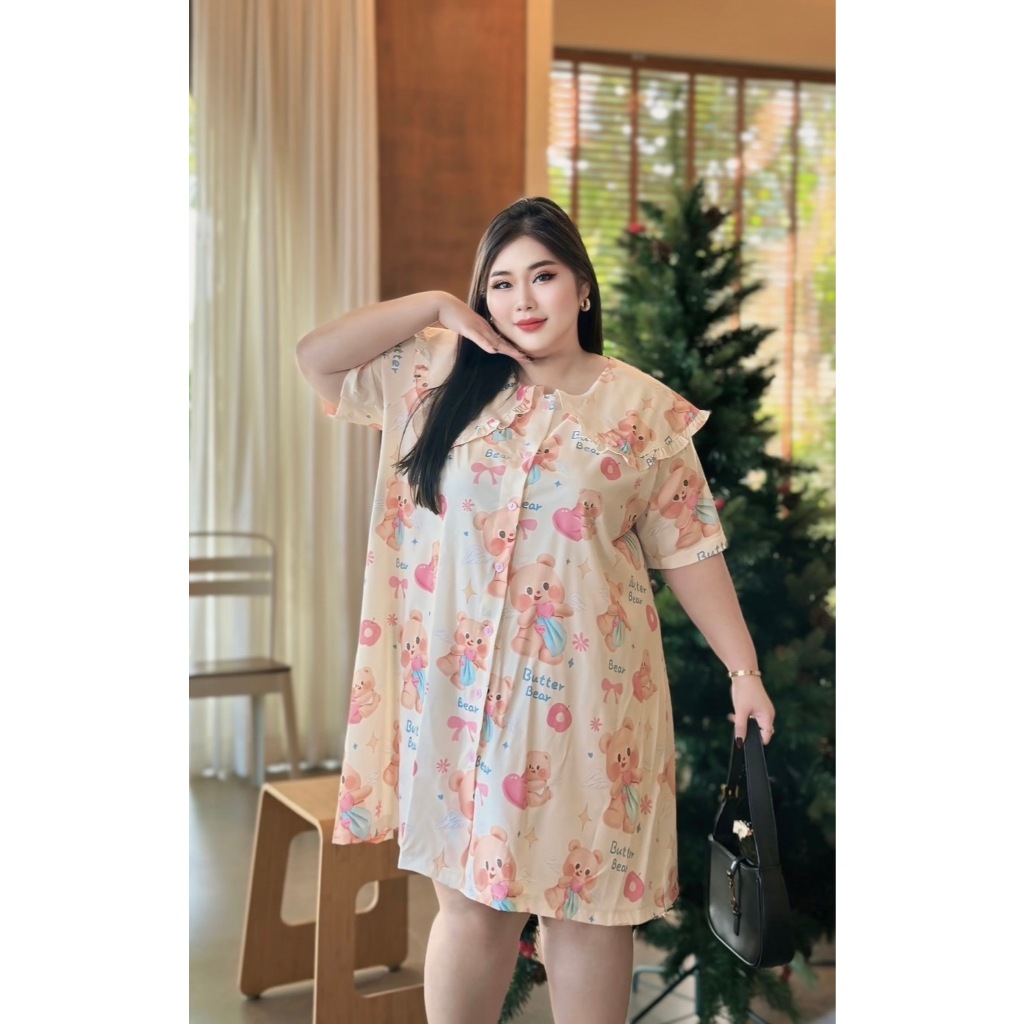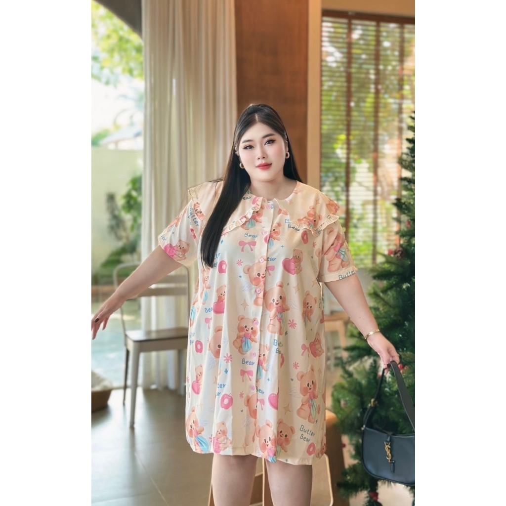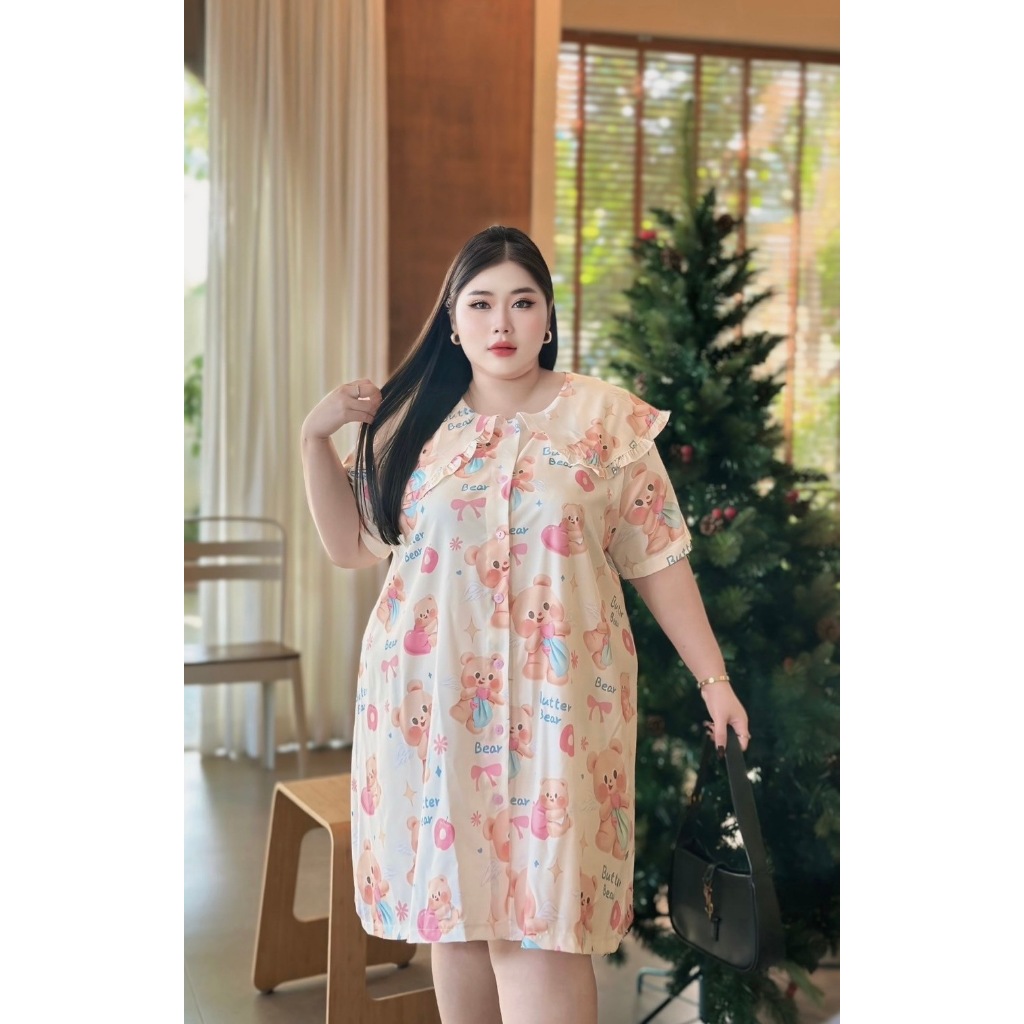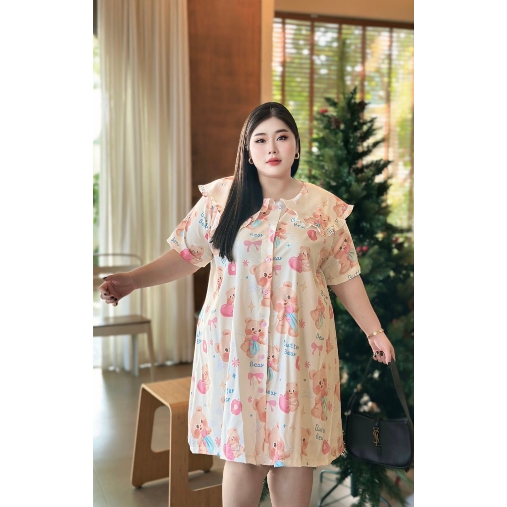 มินิเดรส พิมพ์ลายน้องหมีเนย คอบัว ทรงเอ แขนสั้น ทรงน่ารัก ใส่ได้ตลอด พลัสไซส์ เสื้อผ้าสาวอวบอ้วน