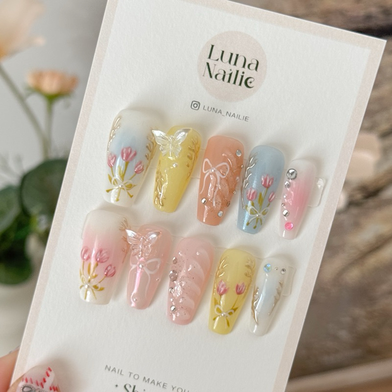 เล็บปลอม เล็บเจลสำเร็จรูป สไตล์หวานๆ พาสเทล handmade | Luna_Nailie