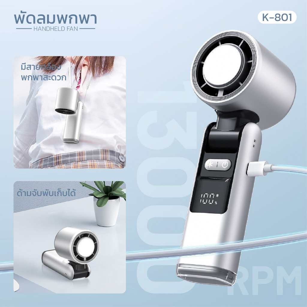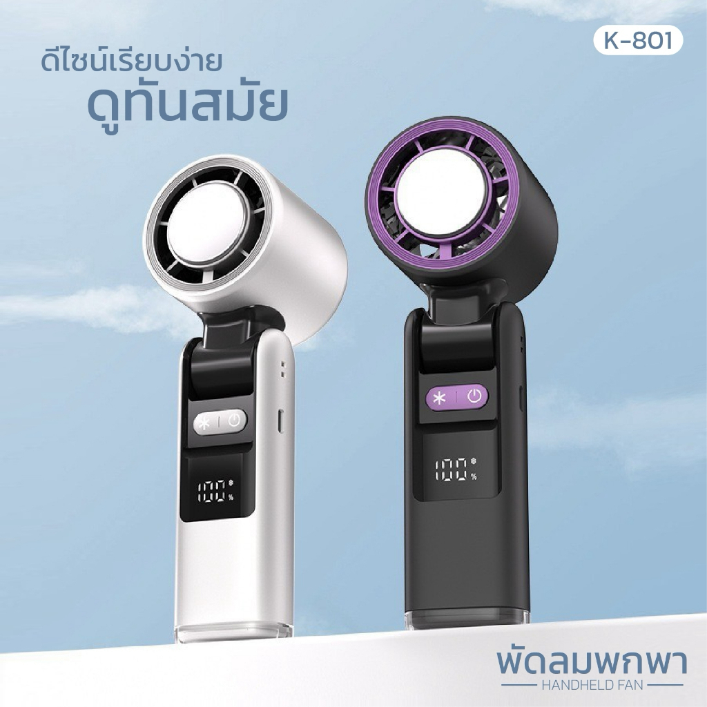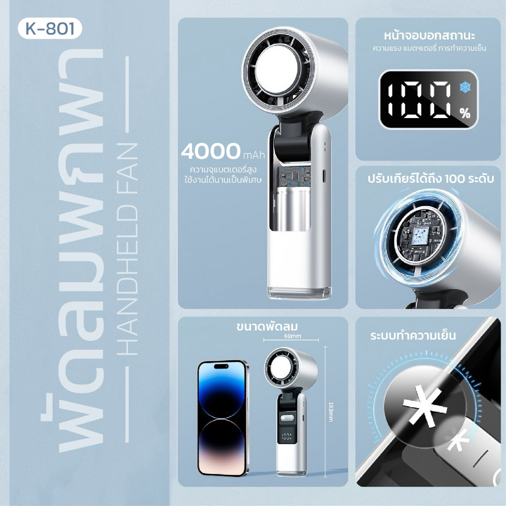 พัดลมไอเย็นพกพา Handheld fan รุ่น k-801 มีไฟฉายในตัว ปรับระดับความเเรงได้100 คล้องคอตั้งโต๊ะ มี 3 สี