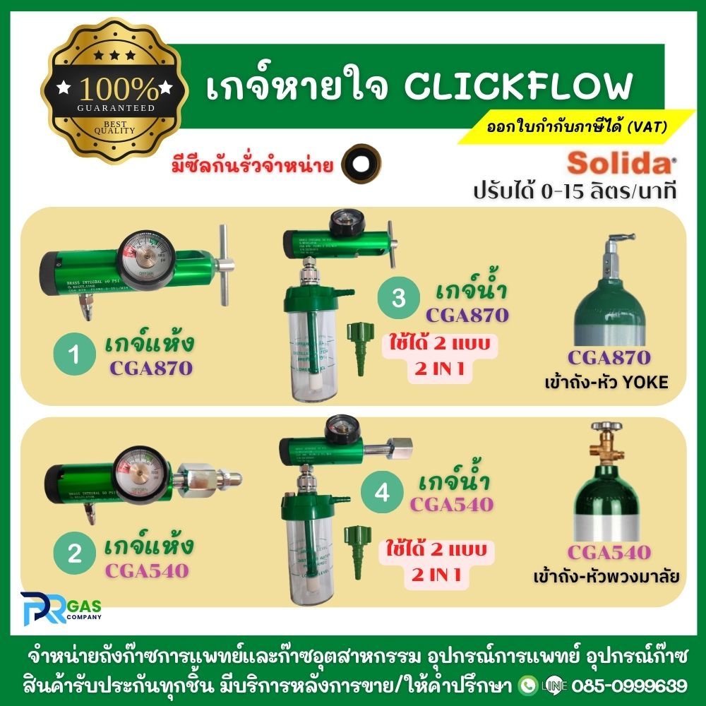 เกจ์หายใจทางการแพทย์ เกจ์ออกซิเจน เกจ์แห้ง/เกจ์น้ำรุ่นใหม่ CLICKFLOW เข้าถัง หัวYOKE (CGA870) / หัวพวงมาลัย (CGA540)
