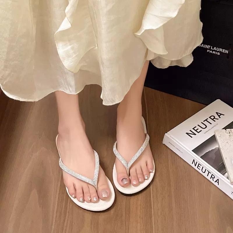 รองเท้าแตะ ส้นแบน ประดับเพชร เหมาะกับเดินชายหาดกลางแจ้ง แฟชั่นสําหรับผู้หญิง