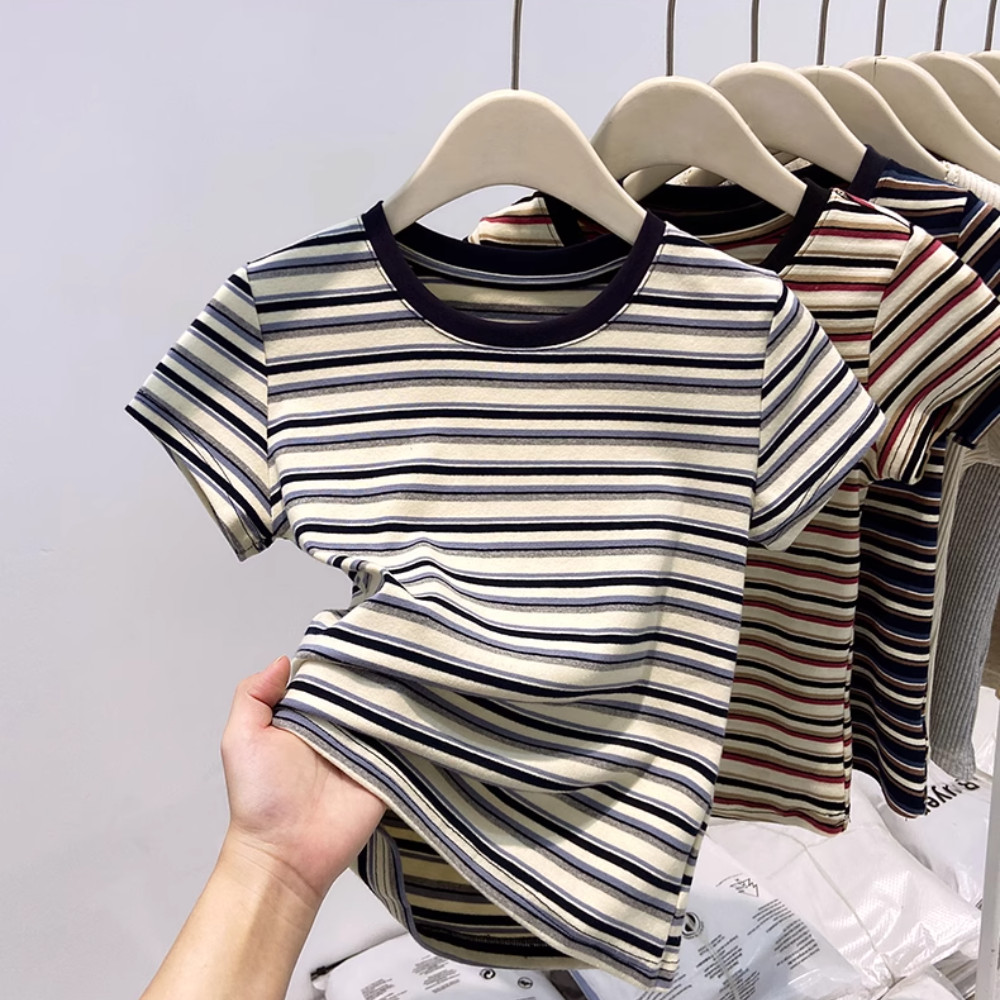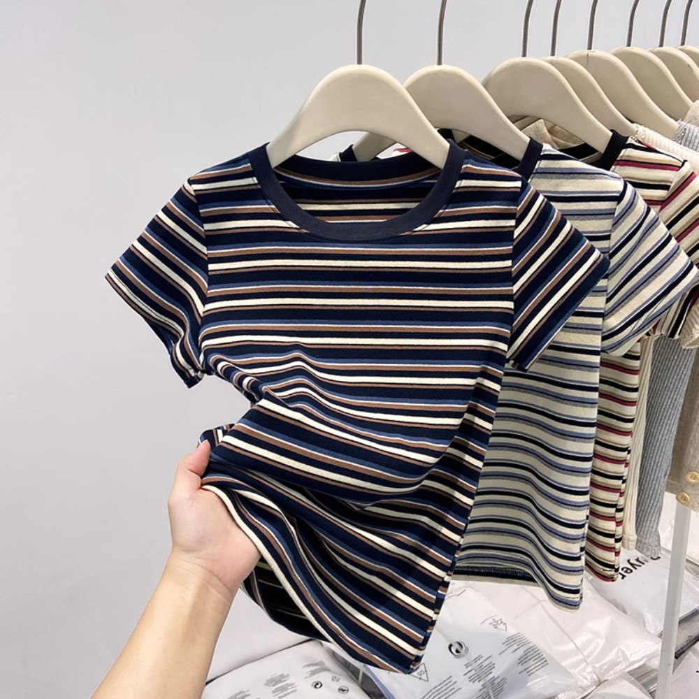BH ฤดูร้อนผู้หญิงสี-Contrast ลายผ้าฝ้ายนุ่มแขนสั้นเสื้อยืดไหล่ปิดสำหรับ