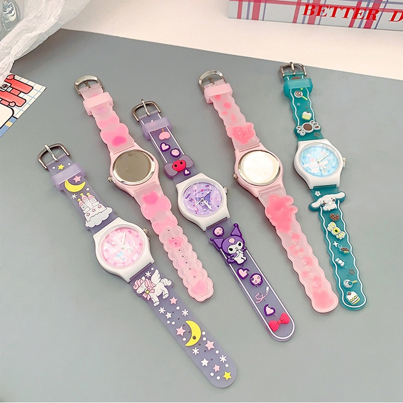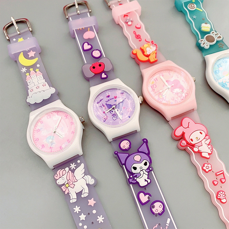 SANRIO นาฬิกาข้อมือ สายซิลิโคน กันน้ํา ลาย Kuromi Hello Kitty ยูนิคอร์น 3D สีมาการอง คุณภาพสูง สําหรับเด็กนักเรียน