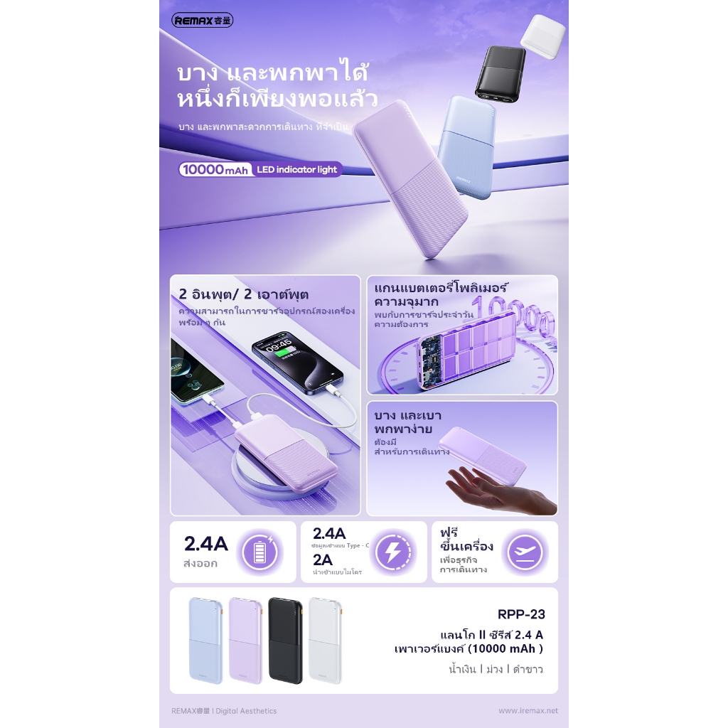 REMAX (การรับรอง 3C) พาวเวอร์แบงค์มือถือ RPP-23 10000mAh อย่างเป็นทางการ รองรับ Android/iOS 5V/2.4A
