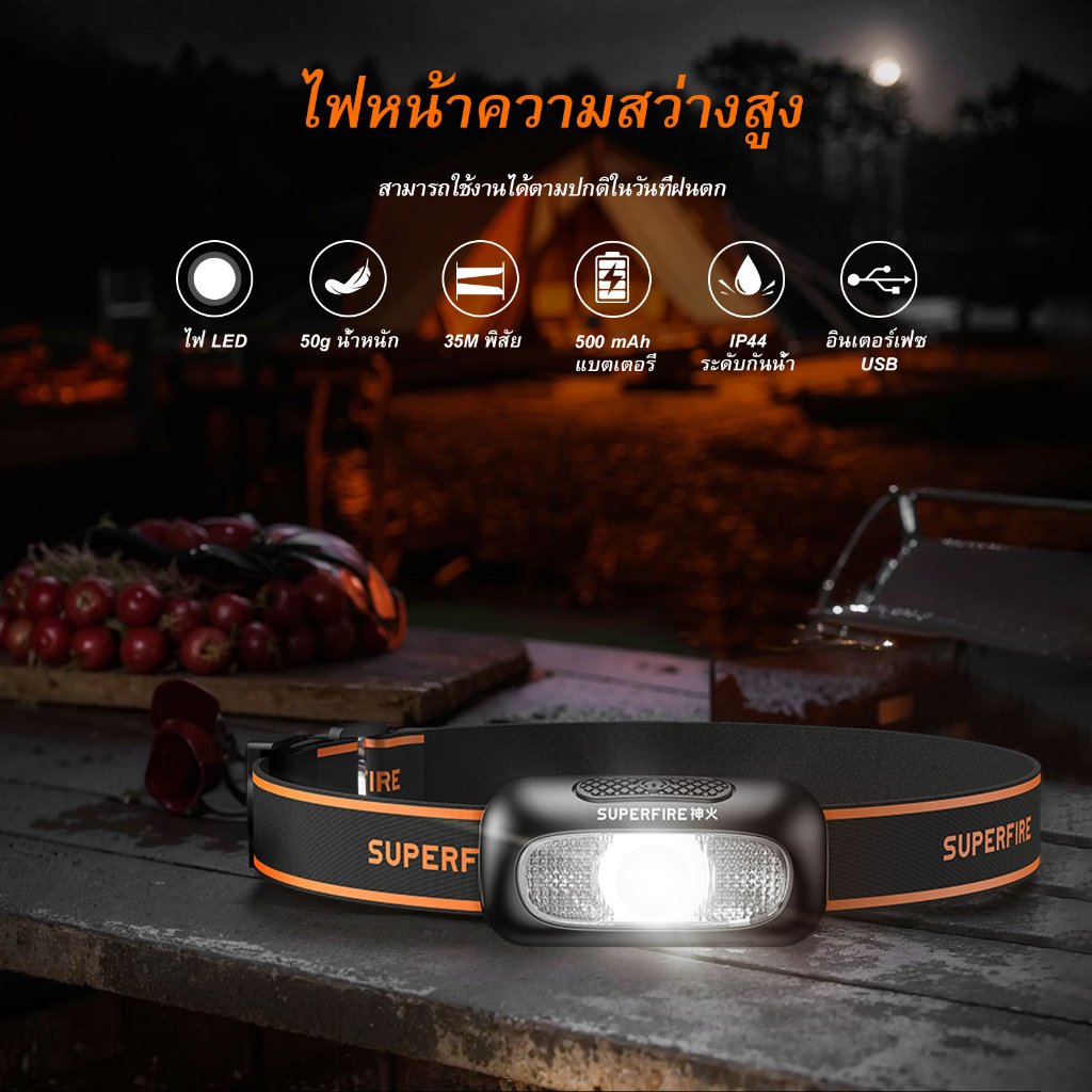 SUPERFIRE HL05 2W การเหนี่ยวนำ LED ไฟหน้า ประเภท-C ไฟหน้าไฟฉายแบบชาร์จไฟได้ แคมป์ปิ้ง แลนเทิร์น