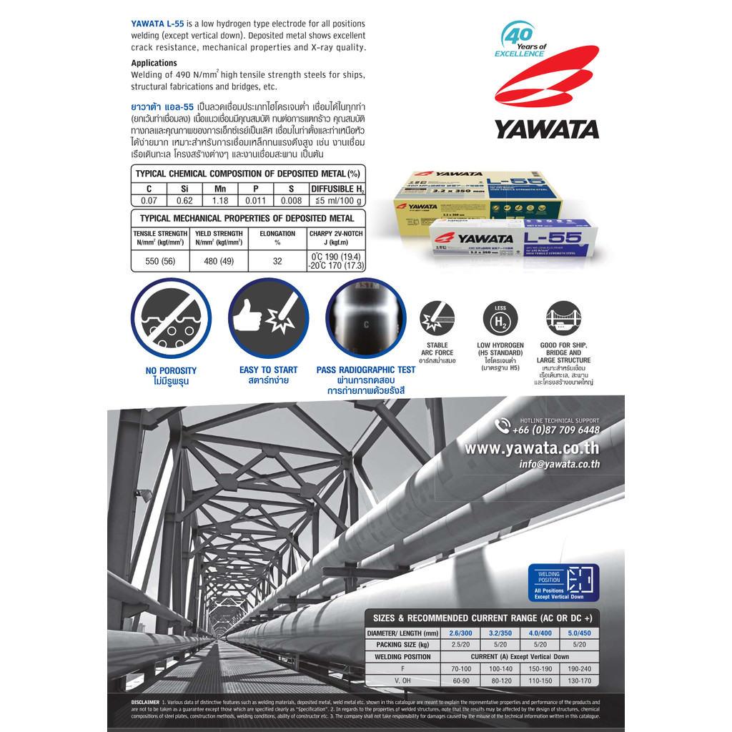 Yawata L-55 (ยกกล่อง 20 kgs) ลวดเชื่อมไฟฟ้า ยาวาต้า ทนแรงดึงสูง 490N/mm2 ลวด E7016