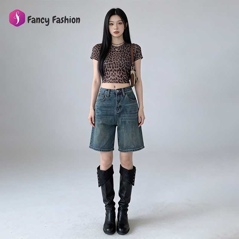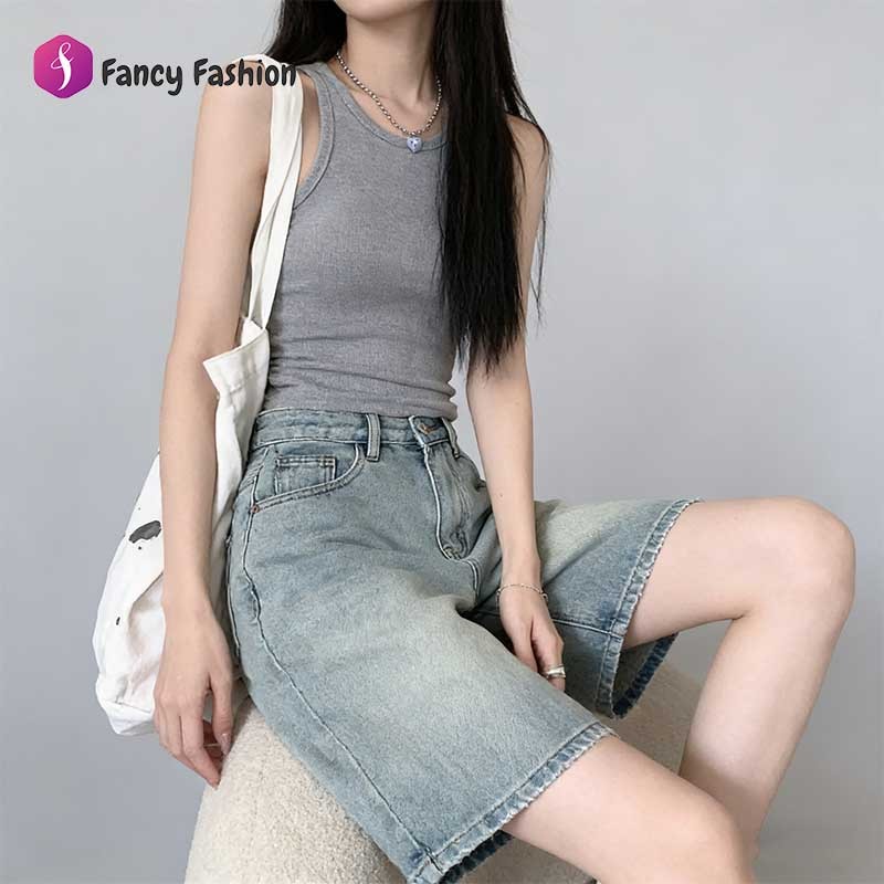 Fancy Fashion กางเกงยีนส์ชอตขาสูง แคตต์ลาวส์ ล้างย้อนวินเทจ ทำขายาว สบายผสมผสานง่าย