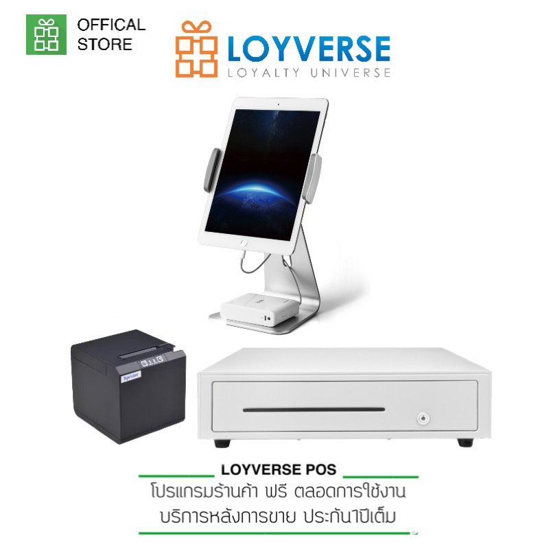 Loyverse POS ฐานAP7S อลูมินั่มสีเงิน POS-KIOSK เครื่องพิมพ์ 58IIK WiFi / USB ลิ้นชักเก็บเงินอัตโนมัติ ใช้กับทุกซอฟ