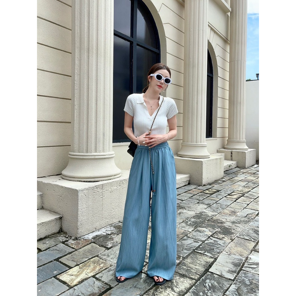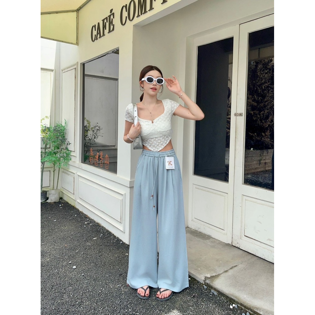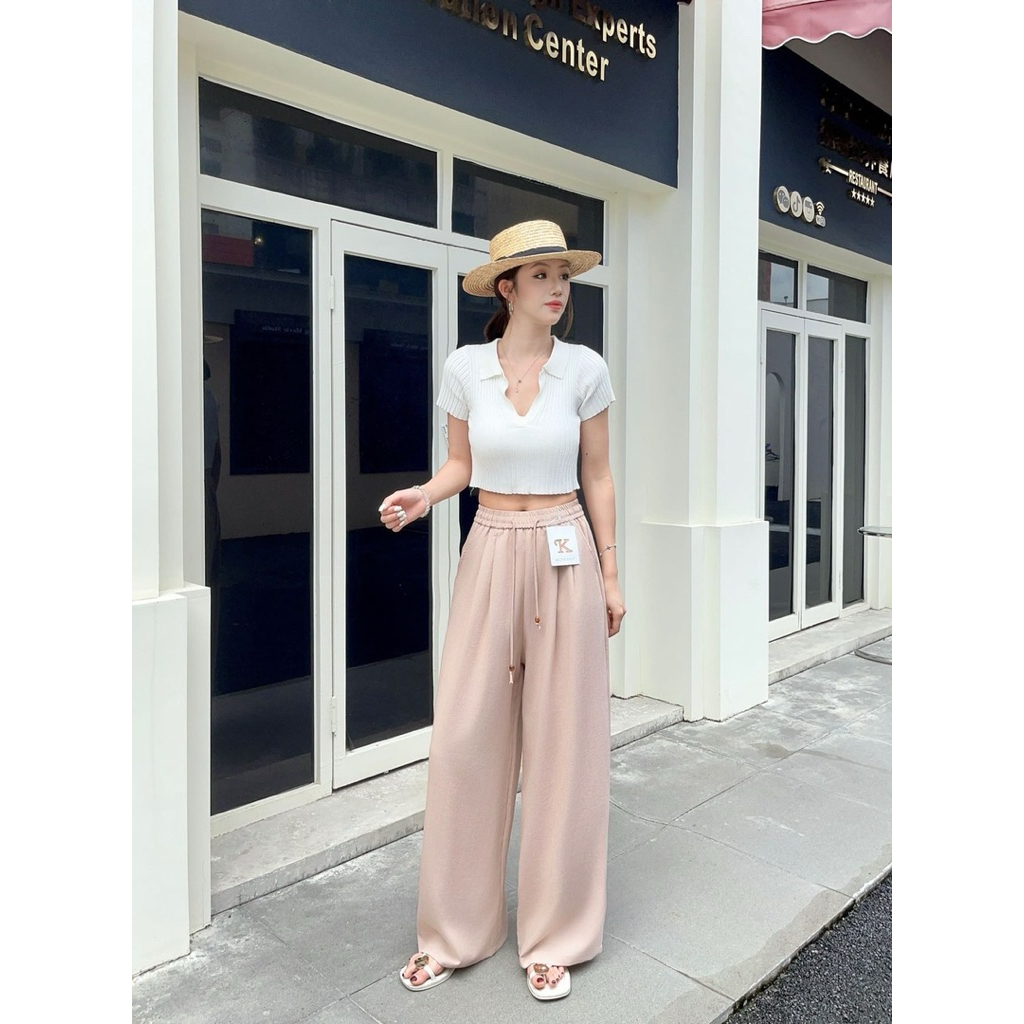 กางเกงขายาวทรงกระบอก เอวยางยืด ผ้าลินินป้าย Keltis