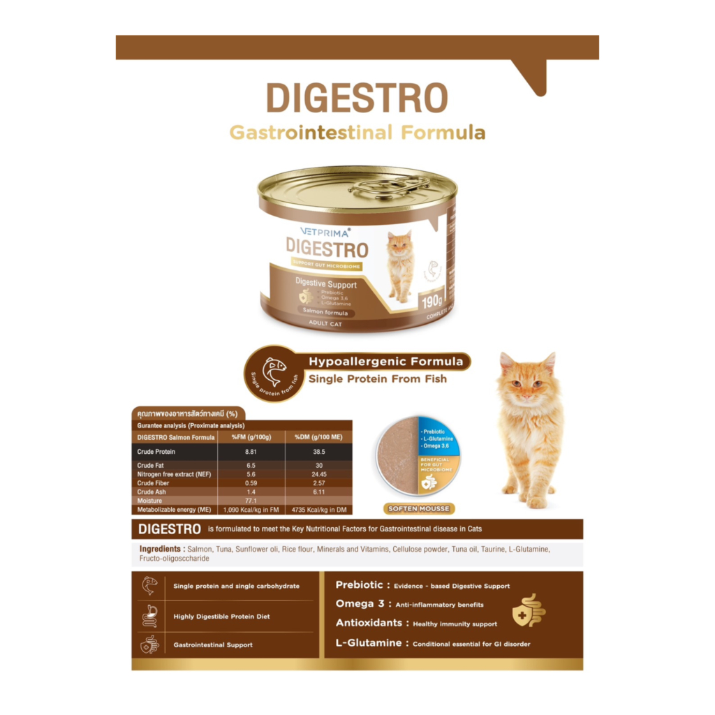 Vetprima Digestro Adult Cat สูตรทางเดินอาหารสำหรับแมวที่แพ้โปรตีนจาก ไก่ หมู วัว 190g.x 12กระป๋อง