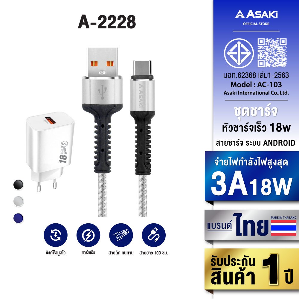 Asaki 2IN1 Charger ชุดชาร์จ มอก. ชาร์จเร็ว 3A สาย Type-C USB ยาว 1 เมตร รุ่น A-2228 - รับประกัน 1 ปี