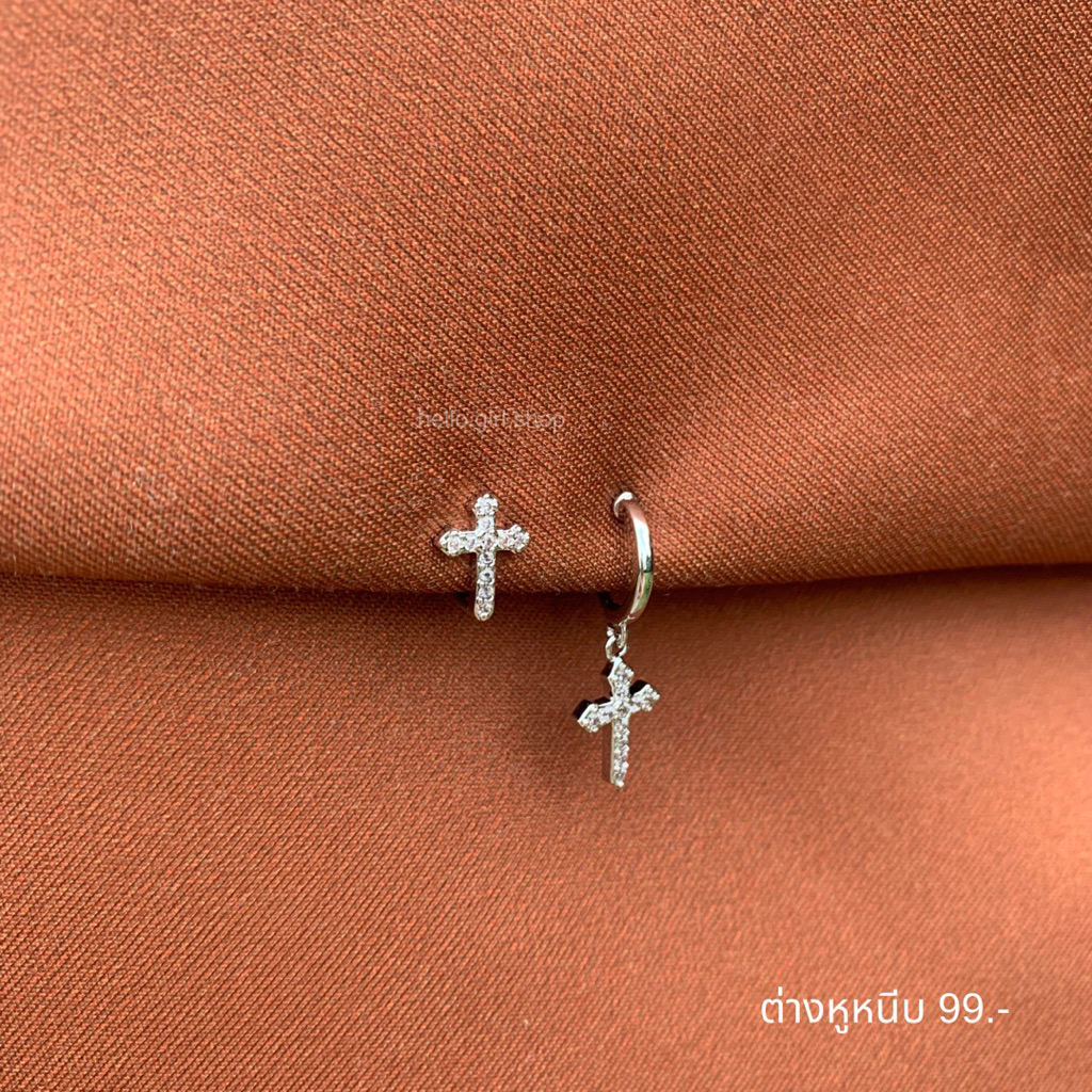 ( ต่างหูหนีบ ขดลวด ) ต่างหูห่วงไม้กางเขน มินิมอล สีเงิน