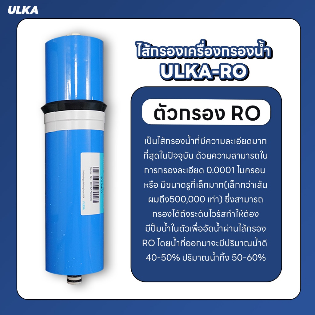 ไส้กรองเครื่องกรองน้ำ ULKA RO รุ่น A4 กรองน้ำดื่มสะอาด ปลอดภัย กำจัดคลอรีน สารพิษสิ่งปนเปื้อน สำหรับครอบครัว
