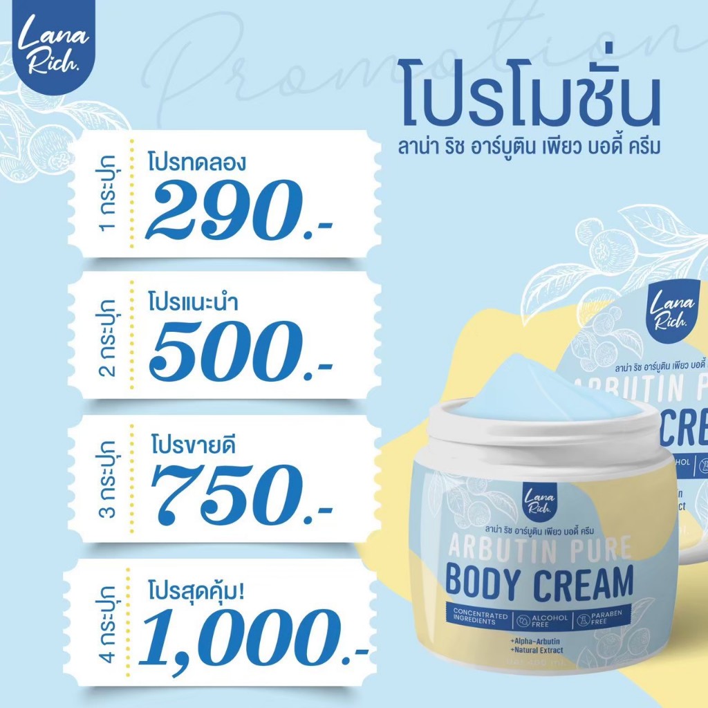 ครีมอาร์บูติน ลาน่าริช (1 กระปุก 400 กรัม) Lana Rich Arbutin อาร์บูตินเพียว บอดี้ ครีม