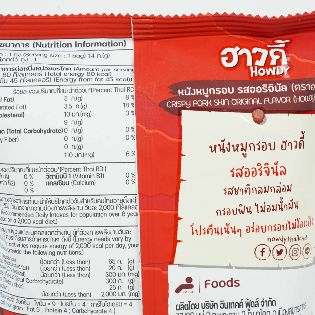 ฮาวดี้ หนังหมูกรอบ รสออริจินัล 14 กรัม (ผลิตจากหนังหมูคุณภาพดี ไร้มัน ไร้แป้ง มีโปรตีน)