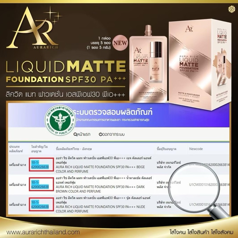 รองพื้นเนื้อแมท ออร่าริช แบบซอง ปกปิดเนียน กันน้ำ กันแดด
