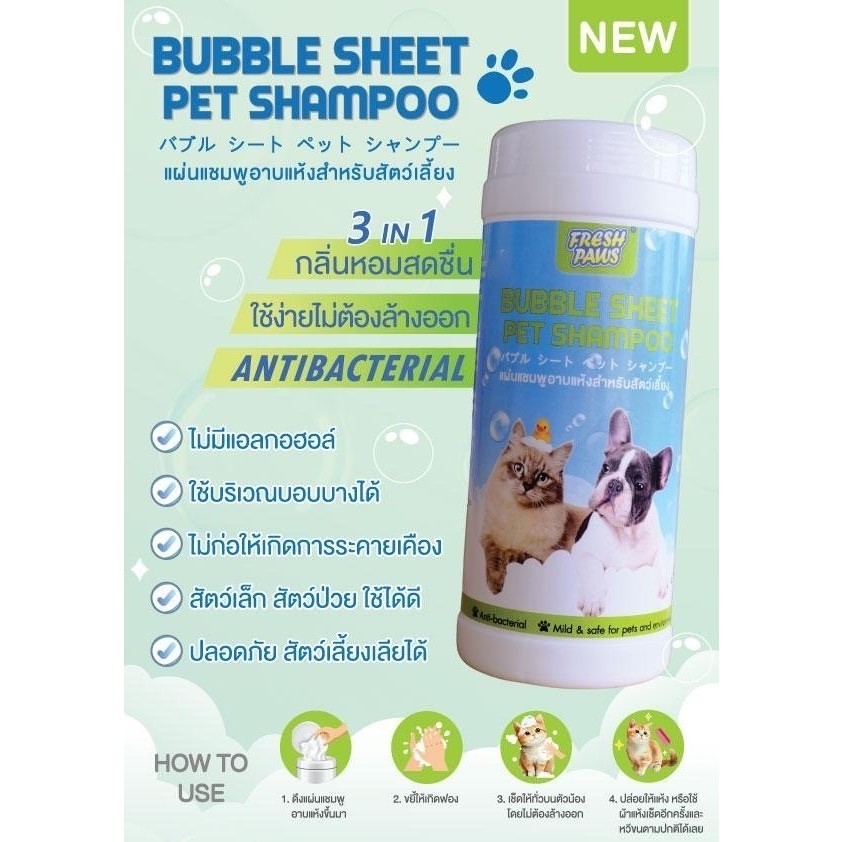 Fresh Paws Bubble Sheet Pet Shampoo แผ่นแชมพูอาบแห้ง สัตว์เลี้ยง เช็ดทำความสะอาด สูตรอ่อนโยน 50แผ่น Fresh Paws