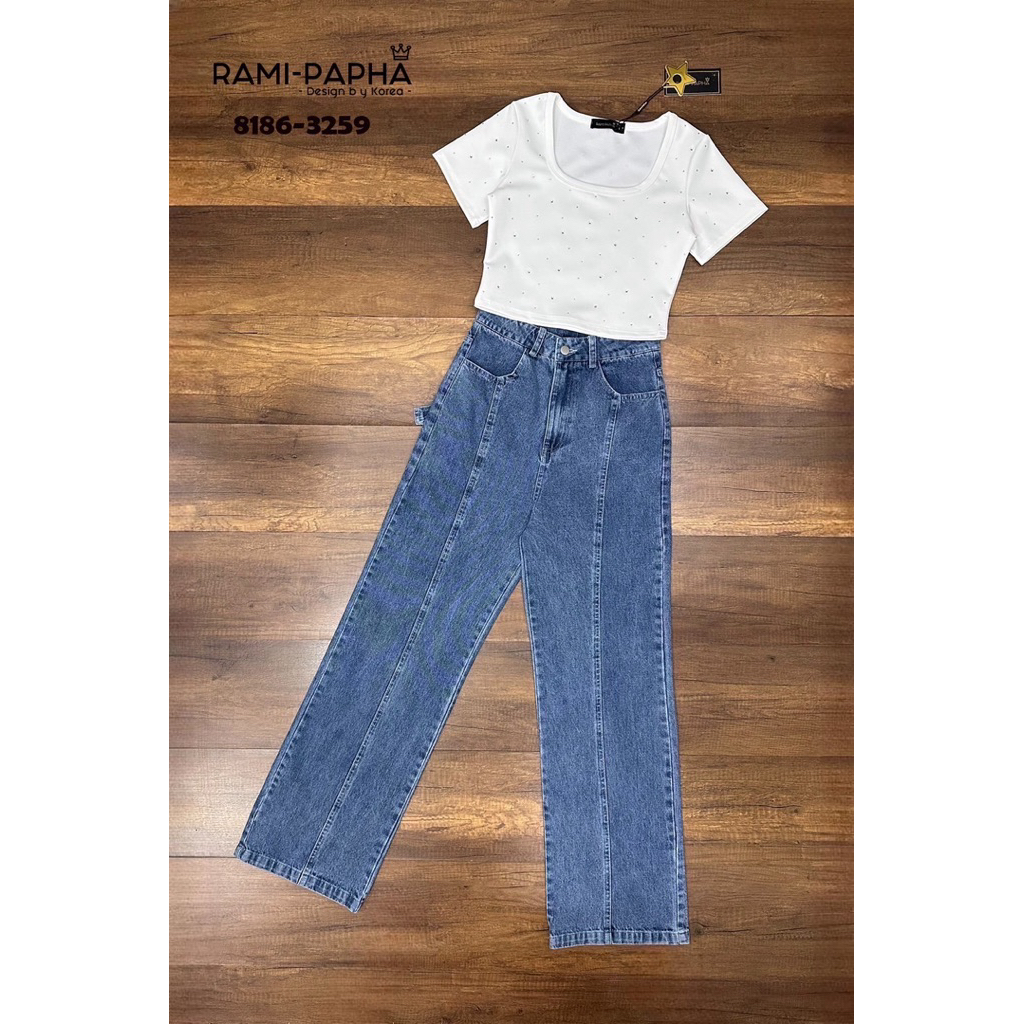 พร้อมส่ง เติม SL⚡️RM 8186 ชุดเซ็ตผู้หญิง เสื้อครอปสีขาวรีดเพรช+กางเกงยีนส์ เป๋าหลังแต่งโบว์