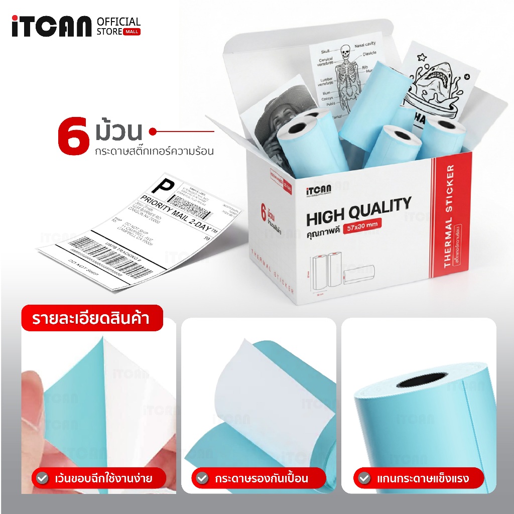 iTCAN สติ๊กเกอร์ความร้อน Peripage 57x30 77x30 สติ๊กเกอร์ความร้อน เว้นขอบ Thermal Paper Label Sticker