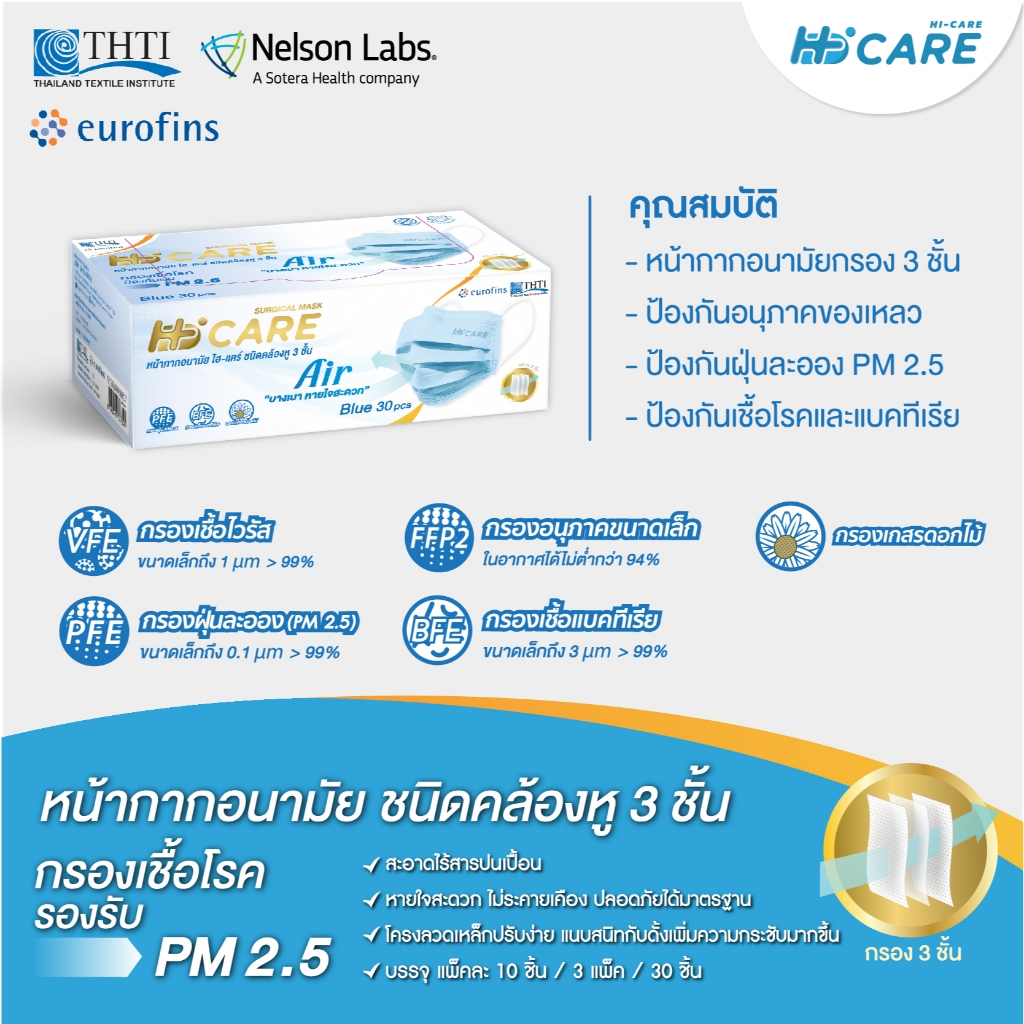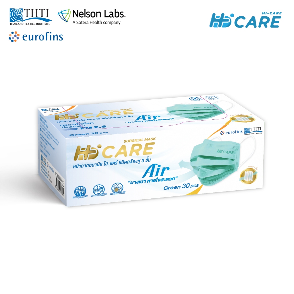 Hi-Care Air [เซท3กล่อง(สีชมพู,สีฟ้า,สีเขียว)] หน้ากากอนามัย เบาสบายหายใจสะดวก แผ่นกรอง3ชั้น กล่องละ 30 ชิ้น