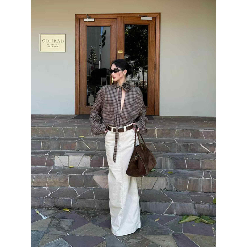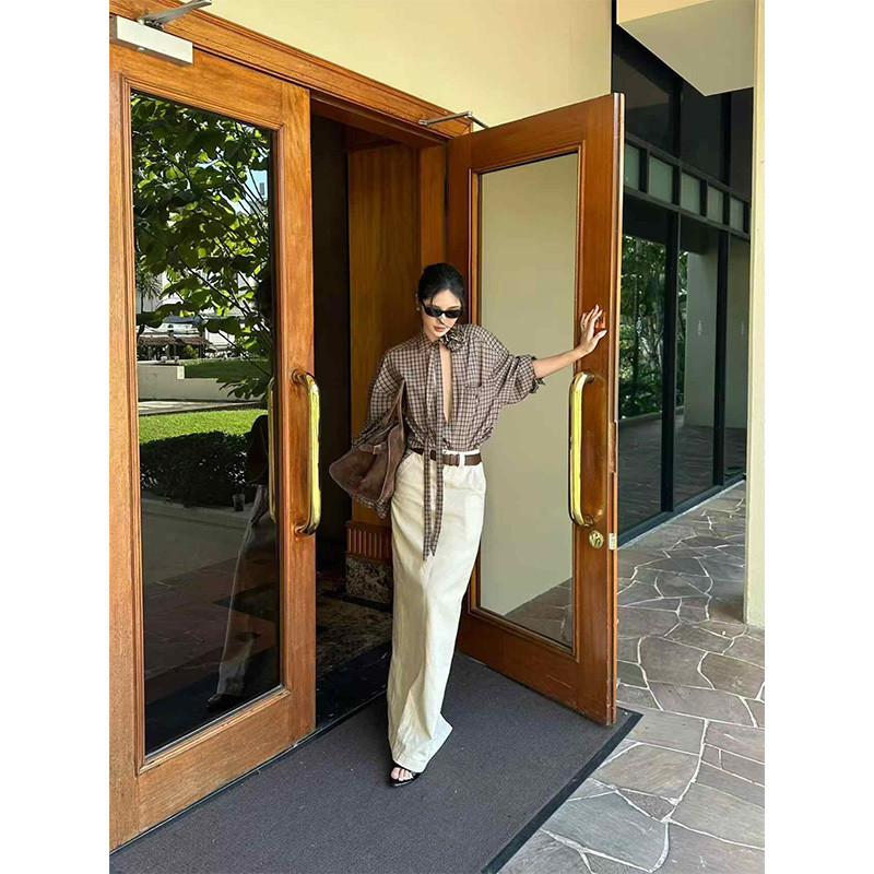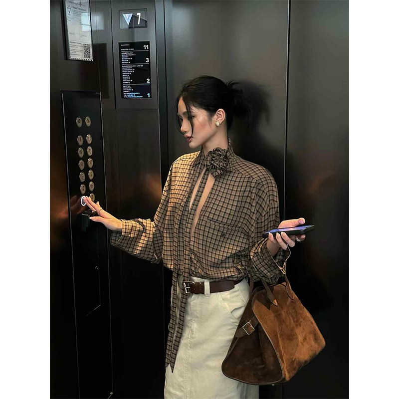 FXDAZI!เสื้อไม่ซ้ําใคร [335 คอลเลกชันคน] อเมริกันย้อนยุคออกแบบตรวจสอบเสื้อผู้หญิงต้นฤดูใบไม้ผลิย้อนยุคลําลองแขนยาวริบบิ้นสีกาแฟแจ็คเก็ต