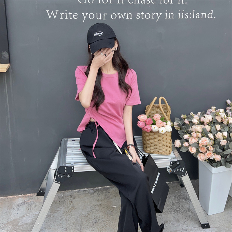 【WJZ】เสื้อยืดสั้นเชือกไม่สม่ําเสมอ Niche สีทึบ【t2#】