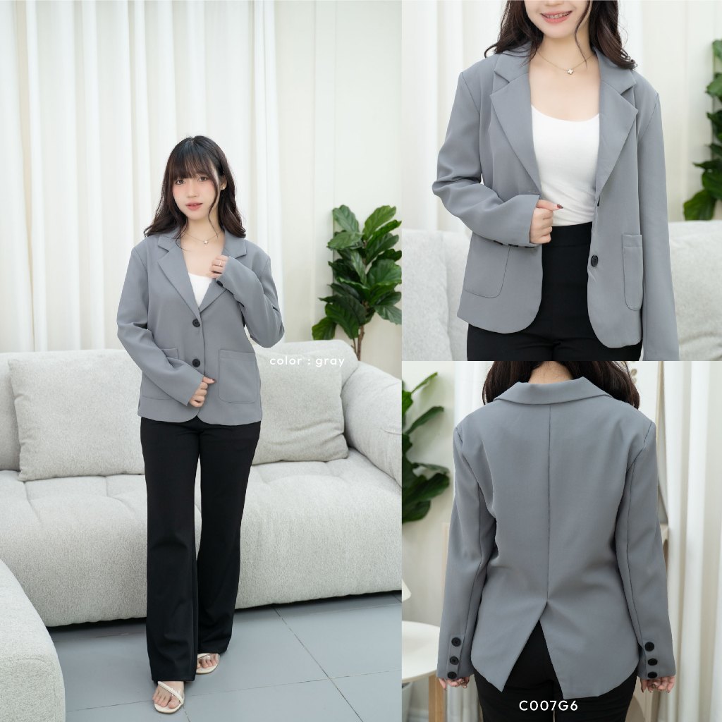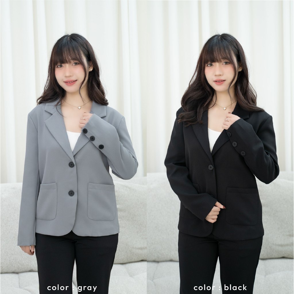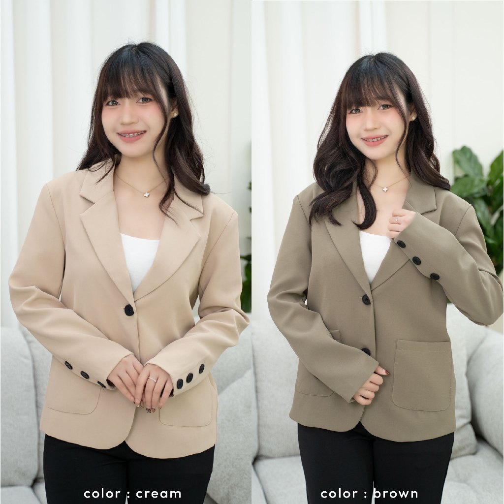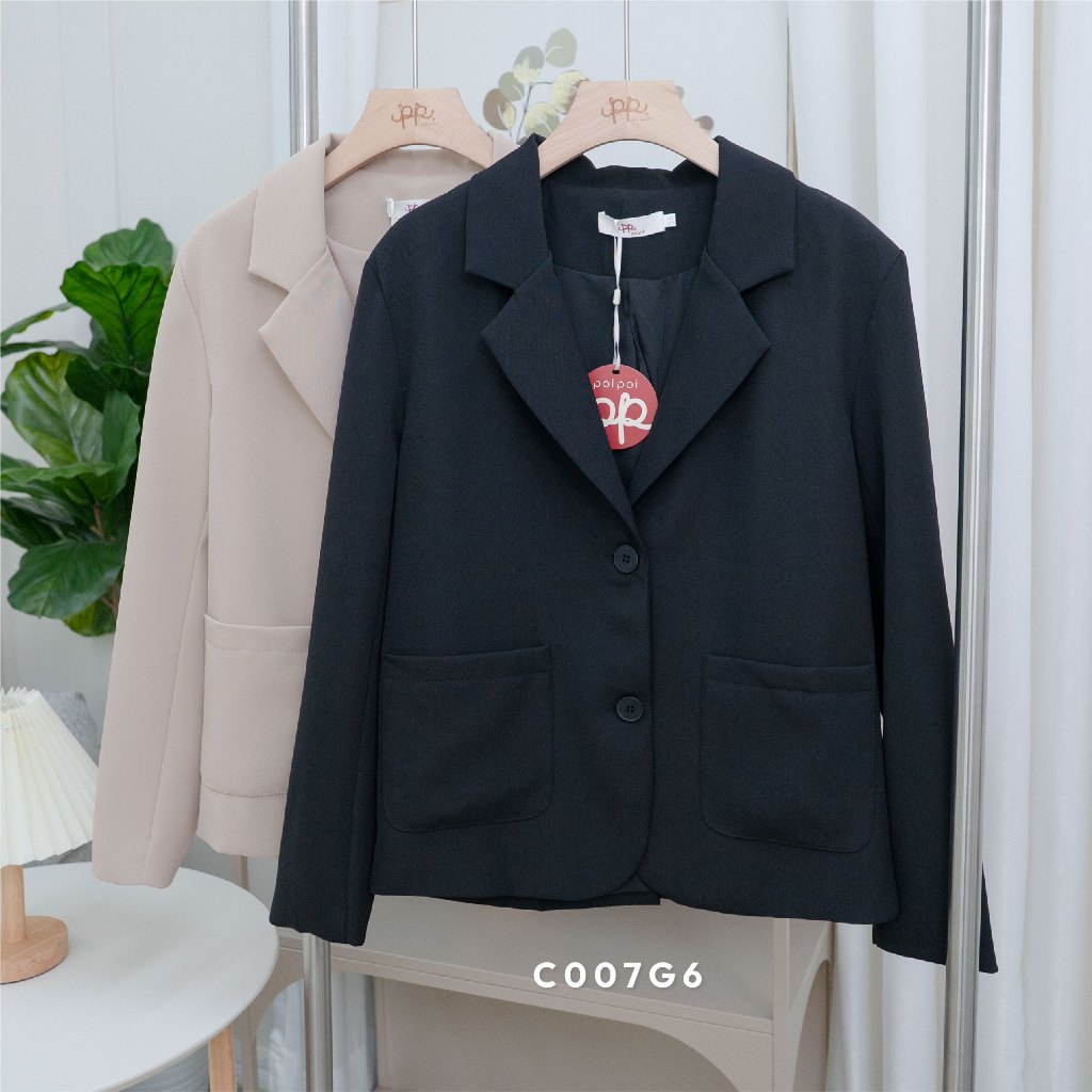 C007G6 : POI เสื้อสูทผ้าเจลลี่คอปกกระดุมหน้าแต่งกระเป๋าสีพื้น ครีม ดำ น้ำตาล เทา