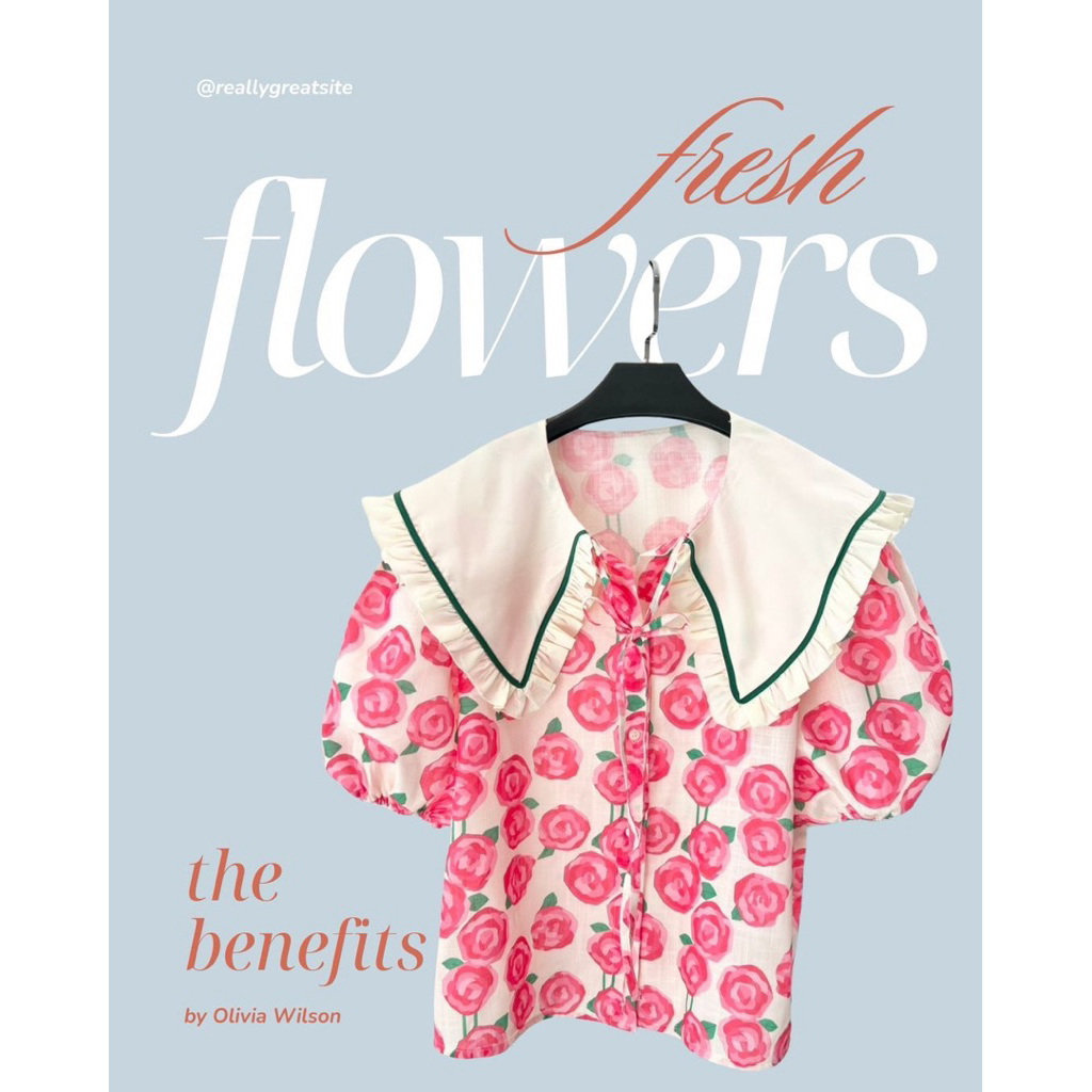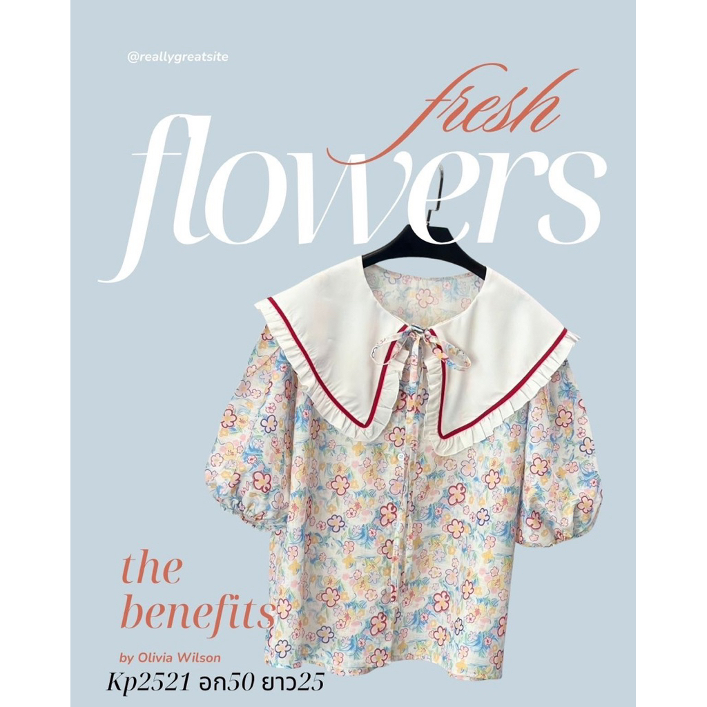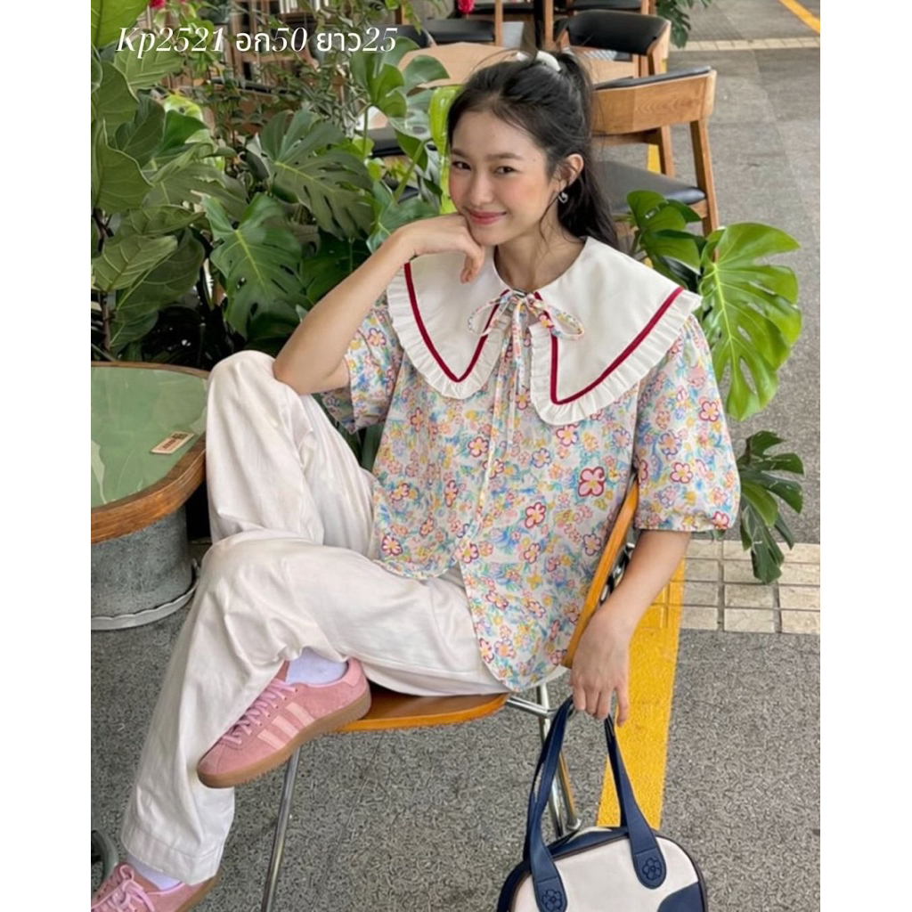 อก50" Summer เสื้อสงกรานต์ เสื้อฮาวายผู้หญิง เสื้อคอปกผูกโบว์ลายดอกแขนพอง แขนตุ๊กตาสุดน่ารักแต่งปกด้วยกุ๊นสีเก๋ๆ-2521