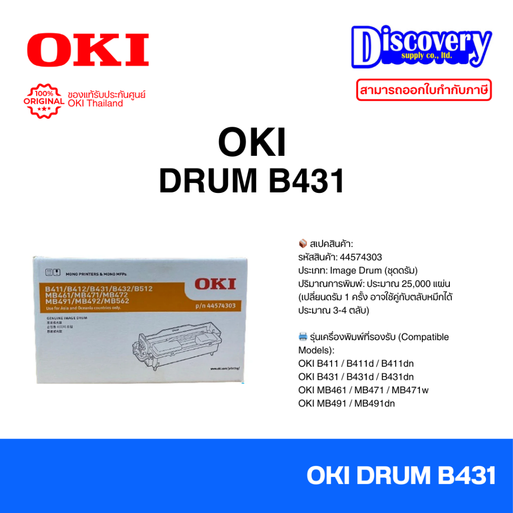OKI Drum B431 (OKI-44574303) Image Drum ชุดดรัมแท้ (25,000 แผ่น) | สำหรับ B411 / B431 / MB461 / MB471 / MB491