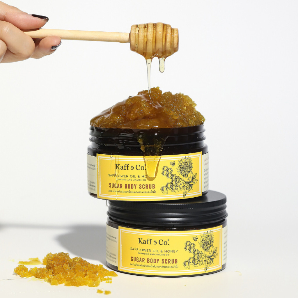 Kaff & Co. สครับน้ำตาลขัดผิวจากน้ำมันดอกคำฝอยและน้ำผึ้ง 240 g ช่วยขจัดเซลล์ผิวอย่างอ่อนโยน